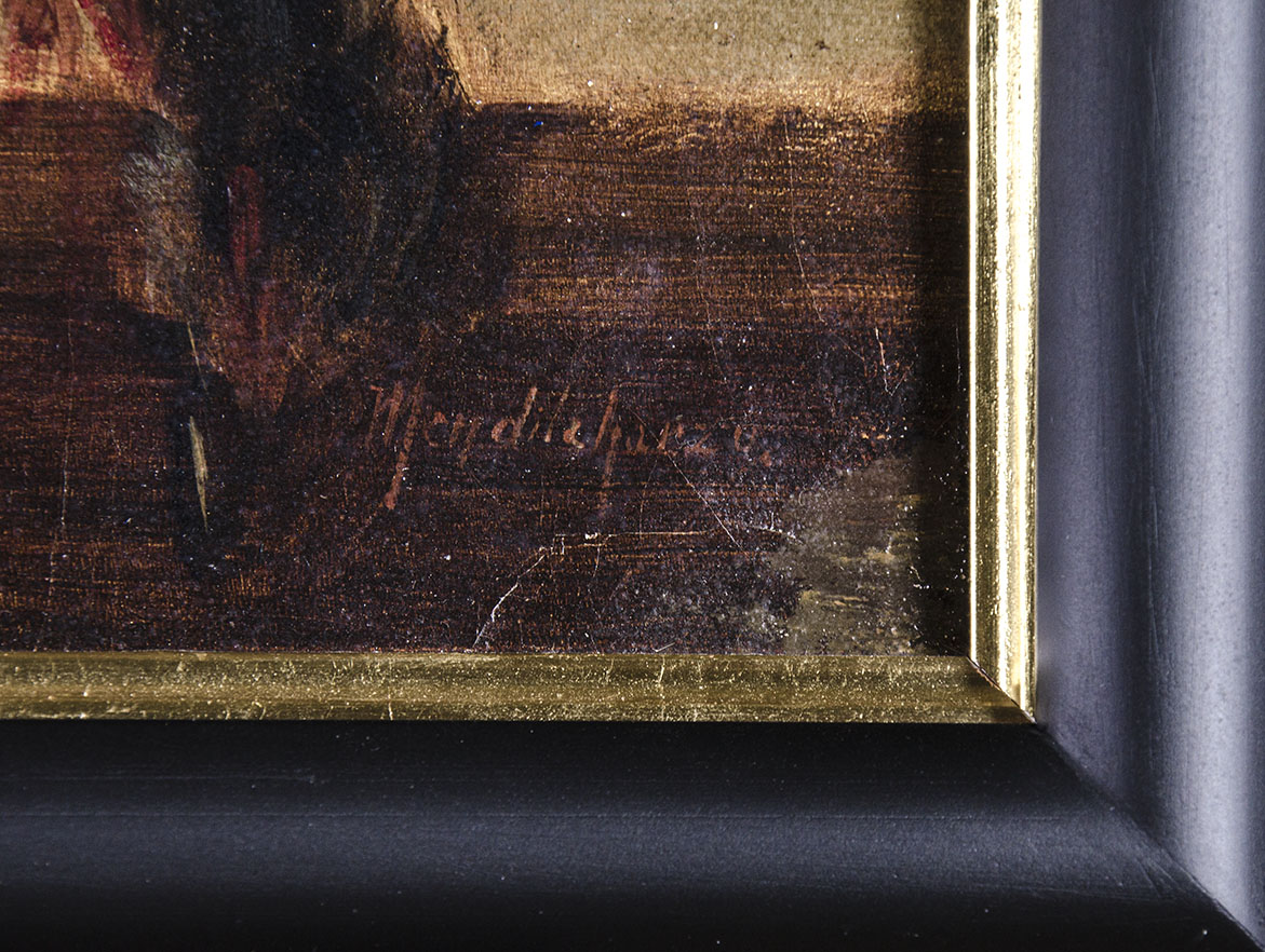 Obra de exquisita factura pictórica. Óleo sobre tela -50 x 65 cm- firmado abajo a la derecha: “Mendilaharzu”. En el reverso: sello de la tela Alexis Ottoz.