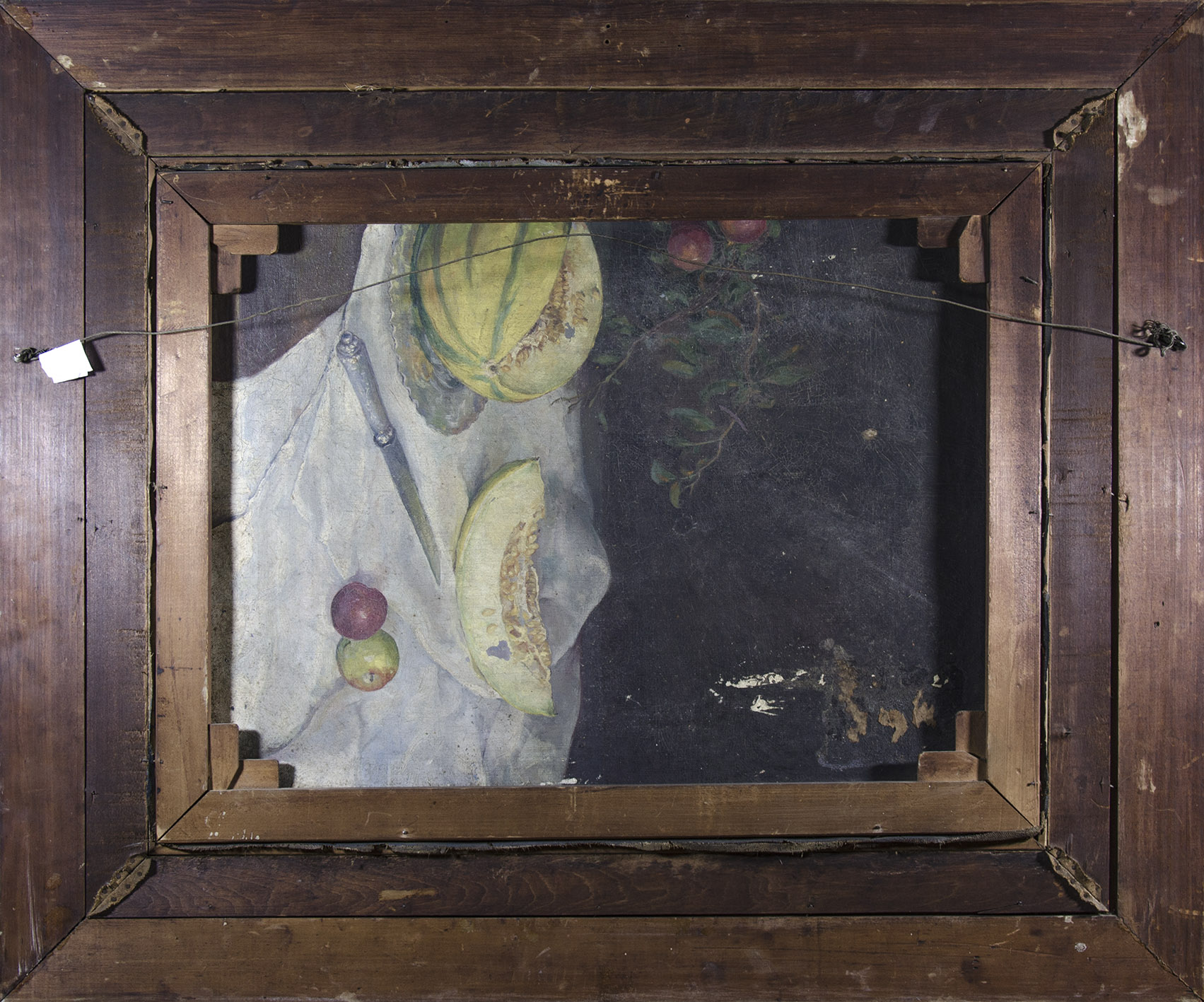 Sobre un papel blanco apoyado sobre una mesa también blanca, De Luca dispuso siete pescados junto a vegetales, limones y cebollas. La maestría del artista en el naturalismo del bodegón se observa en la bien lograda textura acuosa de los pescados, así como en sus ojos, que parecen mirarnos. La obra “esconde” otra en su reverso. En afán de optimizar el uso de sus telas, el autor reutilizó un lienzo que ya había pintado, pero que evidentemente descartó. Otro bodegón, esta vez con frutas. Un melón sobre un plato metálico junto al cuchillo que acaba de cortarlo. Detrás, una rama con ciruelas y sus hojas. A nuestro juicio, composición también bien lograda. La obra, amén de contener dos pinturas, es testigo del proceso creativo del artista. José León Pagano elogió sus bodegones exhibidos en 1938 en la Nordiska Kompaniet de Buenos Aires (1).