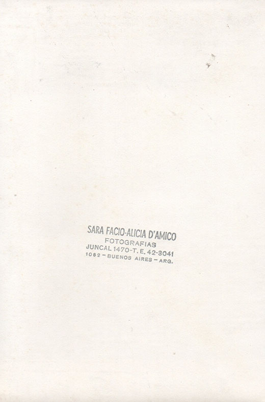 Gelatina de plata en papel fibra brillante doble peso -medidas: 17 x 11,5 x cm-, fechada y firmada, con sello húmedo al dorso, indicando la dirección, en Buenos Aires: Juncal 1470, y el teléfono. Infrecuente obra en el mercado, firmada por ambas autoras.