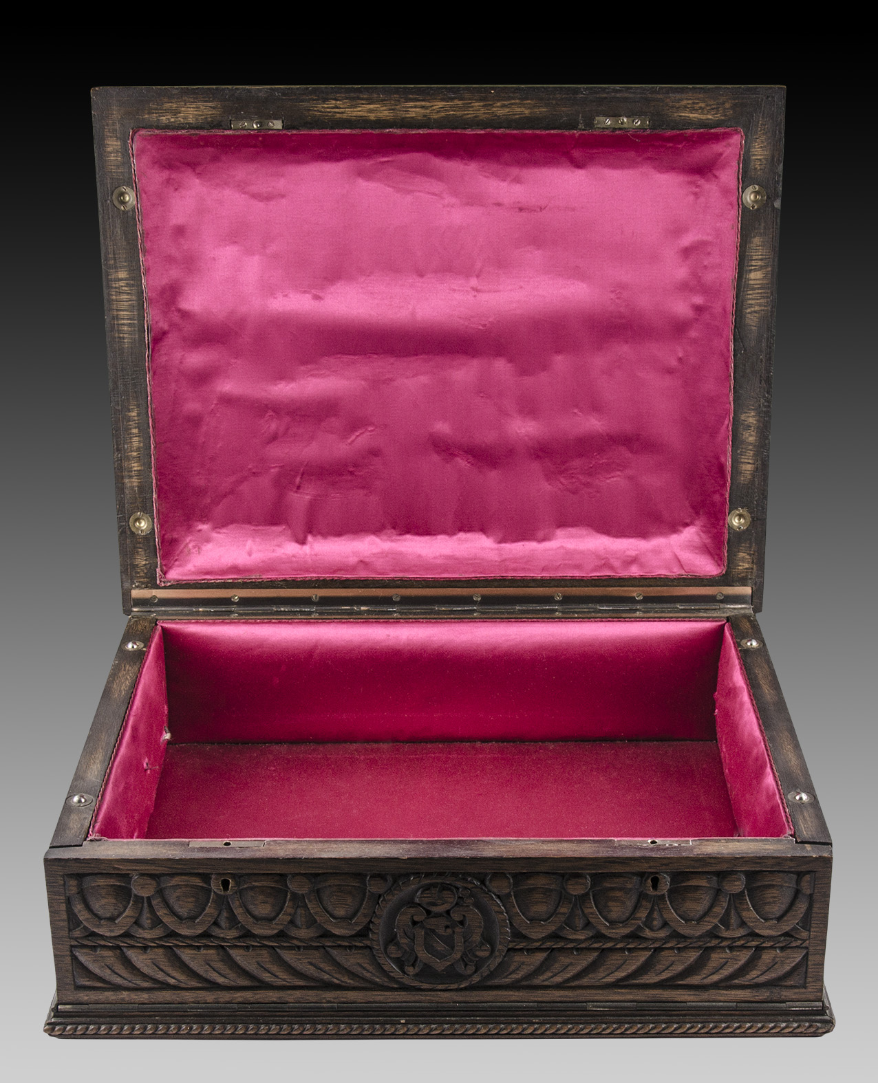 El recipiente lleva en su tapa, al centro, el escudo nacional y otros atributos, como las lanzas y las granadas encendidas, todo rodeado de una guarda tallada. Sus cuatro paredes también aparecen decoradas.