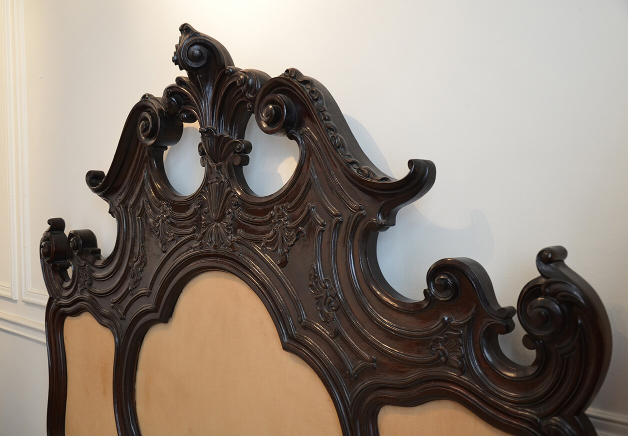 Cama de dos plazas, con su respaldo coronado con un par de volutas y un penacho central, todo tallado con roleos, motivos vegetales y rocallas, y tres tableros tapizados con tela posterior, a reemplazar. El faldón anterior es liso. La cama se apoya sobre cuatro "patas de cabra" que replican simétricamente hacia lo alto.