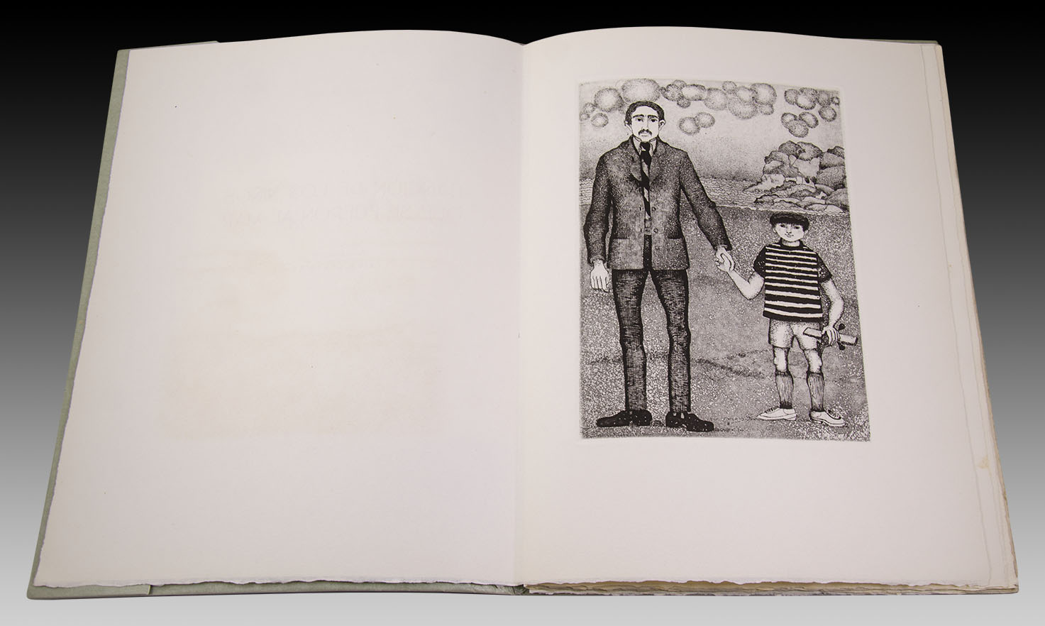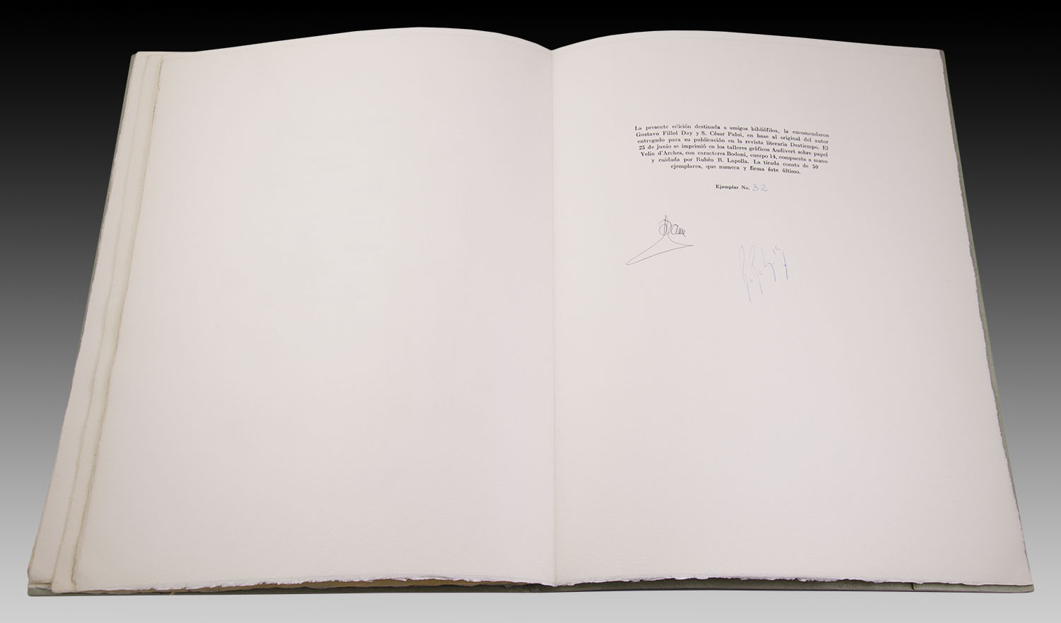 Plaqueta. Ejemplar para bibliófilo -encomendado por Gustavo Fillol Day y S. César Palui-, en rama y con sus barbas, Nº 32, en carpeta de editor. In Folio, (33,5 x 25,5 cm), 12 hojas. Edición no venal de una tirada de 50 ejemplares en papel Velin d’Arches, con caracteres Bodoni, cuerpo 14, compuestos a mano y cuidados por Rubén R. Lapolla. Numerados y firmados por este último. La obra incluye dos aguafuertes de Aída Carballo.