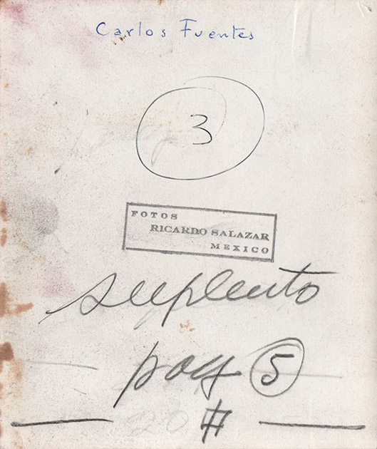 Este retrato de carácter se encuentra dedicado y firmado: "Al gran amigo y crítico Montes i Bradley: Mucho Frondizi y cero Frondas. Su amigo Carlos Fuentes". (1) Como gesto de respeto hacia la obra de Ricardo Salazar, Fuentes escribió la dedicatoria sobre los márgenes del retrato. La referencia al Dr. Arturo Frondizi (1908-1995) habla claramente de sus animadas charlas políticas con el destinatario de la fotografía.