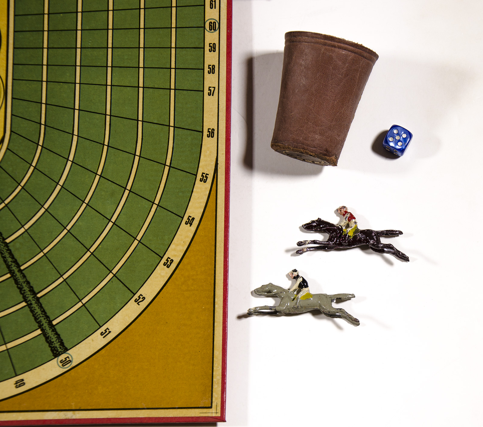 Juego de mesa conservado en su caja original; con el cartón que lleva la pista impresa, los seis caballos de plomo, el cubilete con sus dados y las dos fichas.