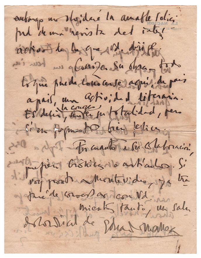 Le asegura a Lasplace: “conozco su obra todo lo que puede conocerse aquí, de país a país (...) Es decir, no la conozco en su totalidad, pero sí en fragmentos bien felices”. El primer libro del uruguayo se tituló “Opiniones literarias” y fue publicado en 1919. Le siguió “La buena cosecha”, en 1923 y un libro de cuentos en 1927: “El hombre que tuvo una idea”. En el momento de la correspondencia ahora ofrecida, dirigía la revista “La Cruz del Sur”, una importante publicación periódica de Montevideo que se editó entre los años 1924 y 1931, a lo largo de 33 números.