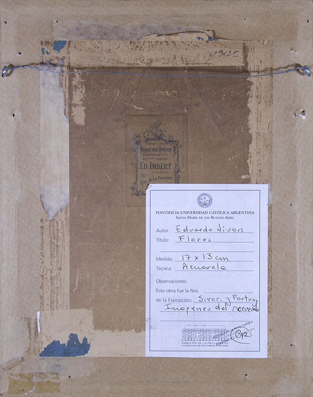 Acuarela sobre papel. Medidas: 17 x 13,5 cm. Obra enmarcada. Al dorso etiqueta de casa de marquería “Miroiterie Dorure Encadrements” de Versalles, Francia. Una segunda etiqueta de la Pontificia Universidad Católica Argentina, certifica su participación en la muestra “Sívori y Fortuny Imágenes del recuerdo”.