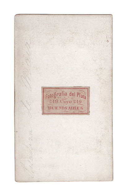 Excepcional conjunto iconográfico, formado por 21 albúminas en formato carte-de-visite, todas en sus cartones de época, los que poseen la identificación de la casa fotográfica -salvo tres de ellos, que es claro advertir que pertenecen a la misma serie- mediante impresiones en tinta o en pequeñas etiquetas rectangulares pegadas en el reverso de los cartones, con su leyenda impresa en tinta roja o negra indicando “Fotografía del Plata” y su dirección sobre la calle Cuyo 249 de Buenos Aires.
