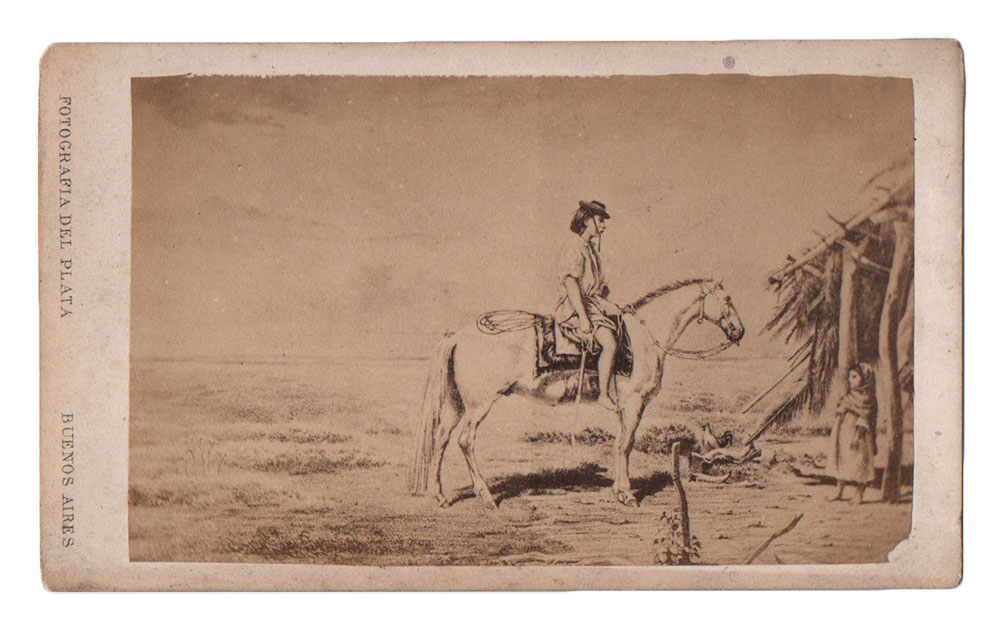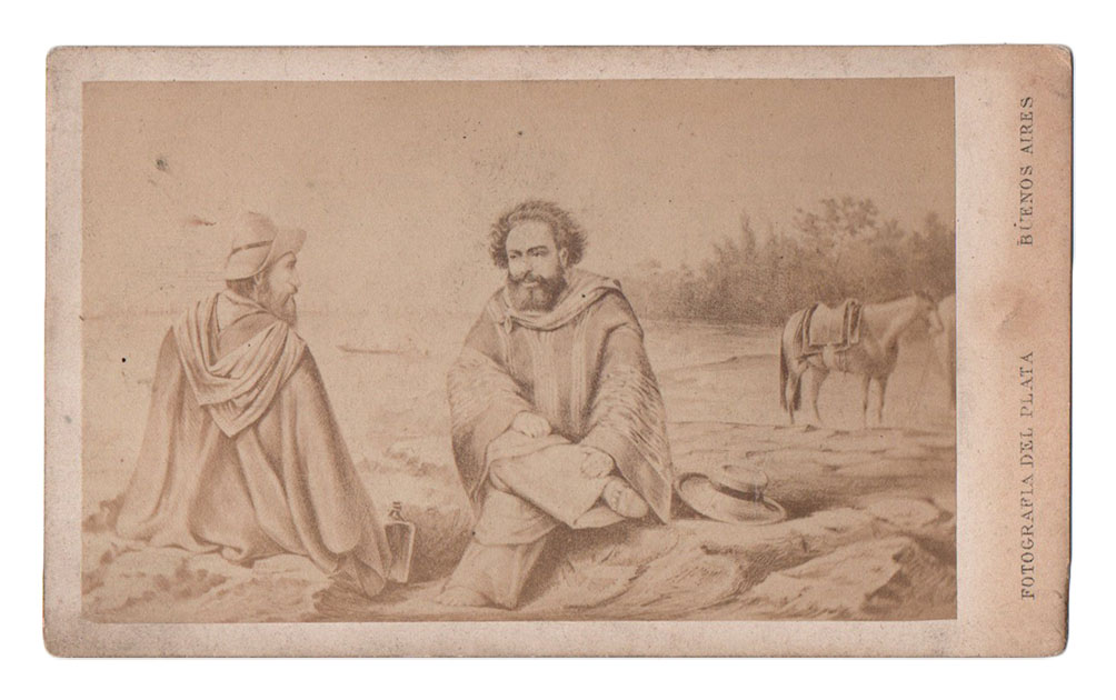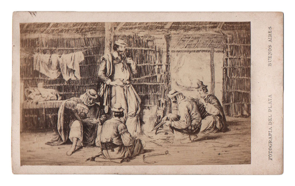 Esta lectura dinámica del costumbrismo permite señalar una conexión con las otras carte-de-visite, las que reproducen las ilustraciones de Henri Meyer, luego director de El Mosquito, para el Fausto de Estanislao del Campo, también salidas del taller litográfico de Pelvilain en 1866 y con la fotografía dedicada a la estampa de Jean Desiré Dulin –autor de estupendas vistas de Buenos Aires- que representa un matadero porteño, que nos remite inmediatamente al célebre texto de Esteban Echeverría. Dulin permaneció en Buenos Aires entre 1858 y 1864, donde trabajó estrechamente con Pelvilain (luego en París imprimió en la casa Lemercier). Tal vez, este conjunto de carte-de-visite es el resultado de un acuerdo comercial entre las dos empresas, Fotografía del Plata y Pelvilain.