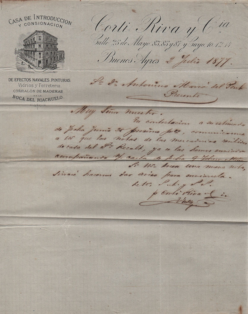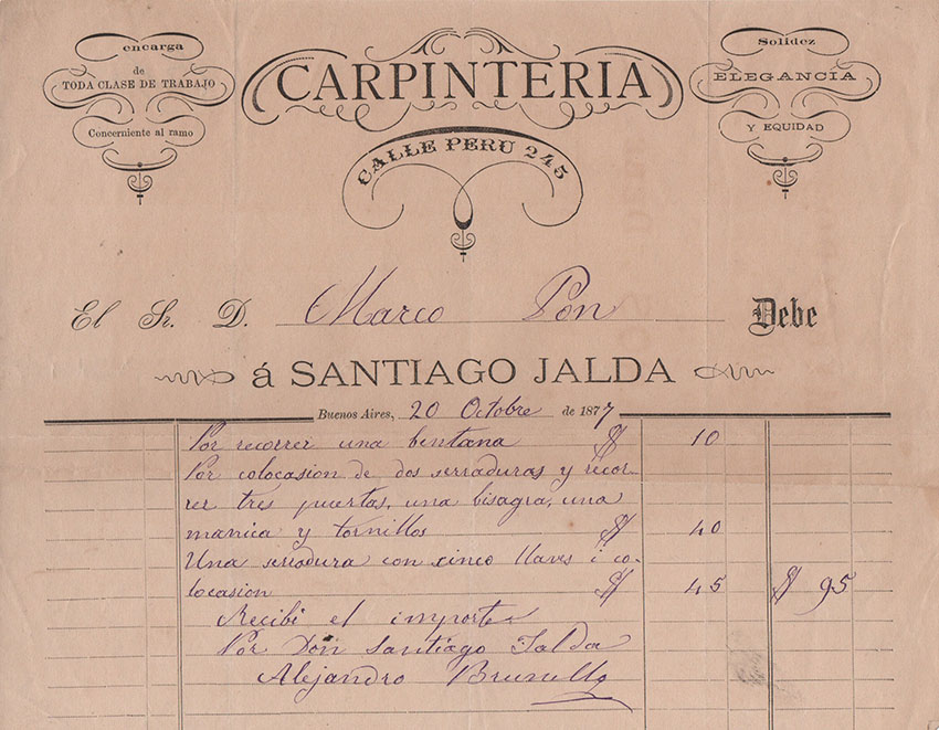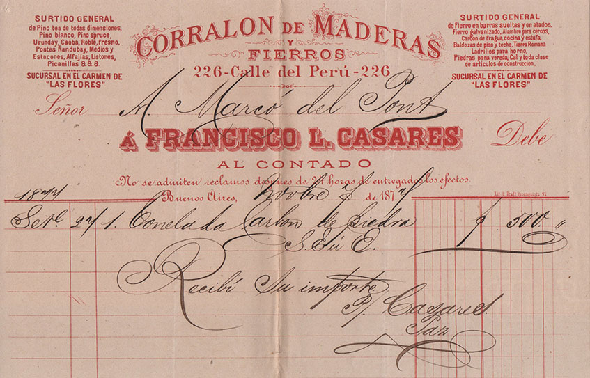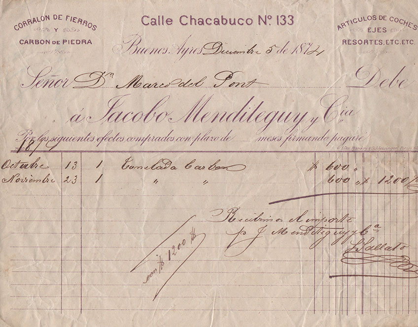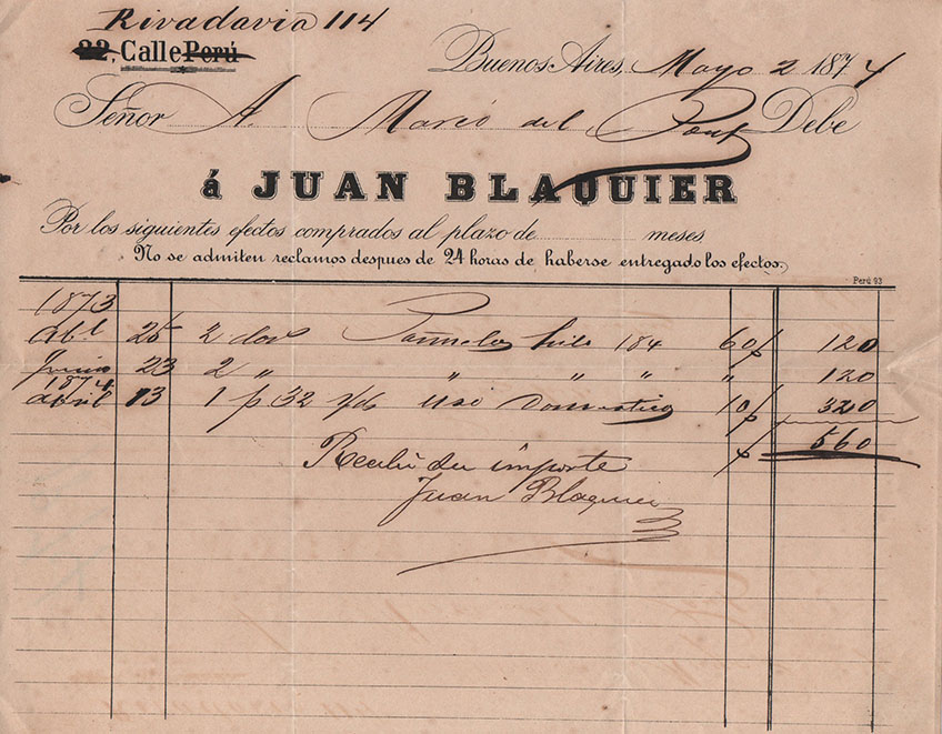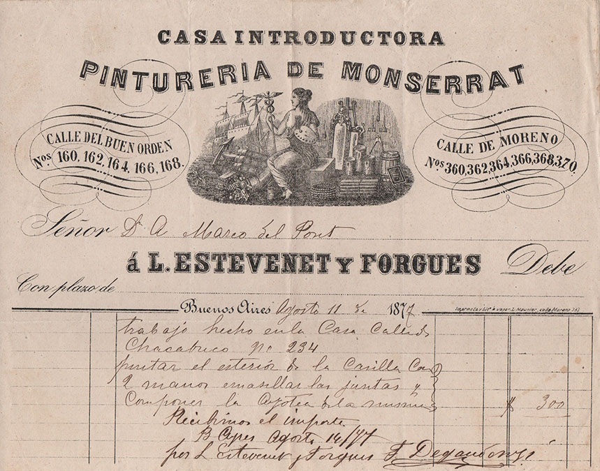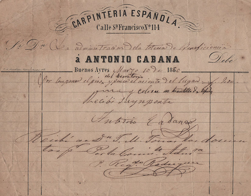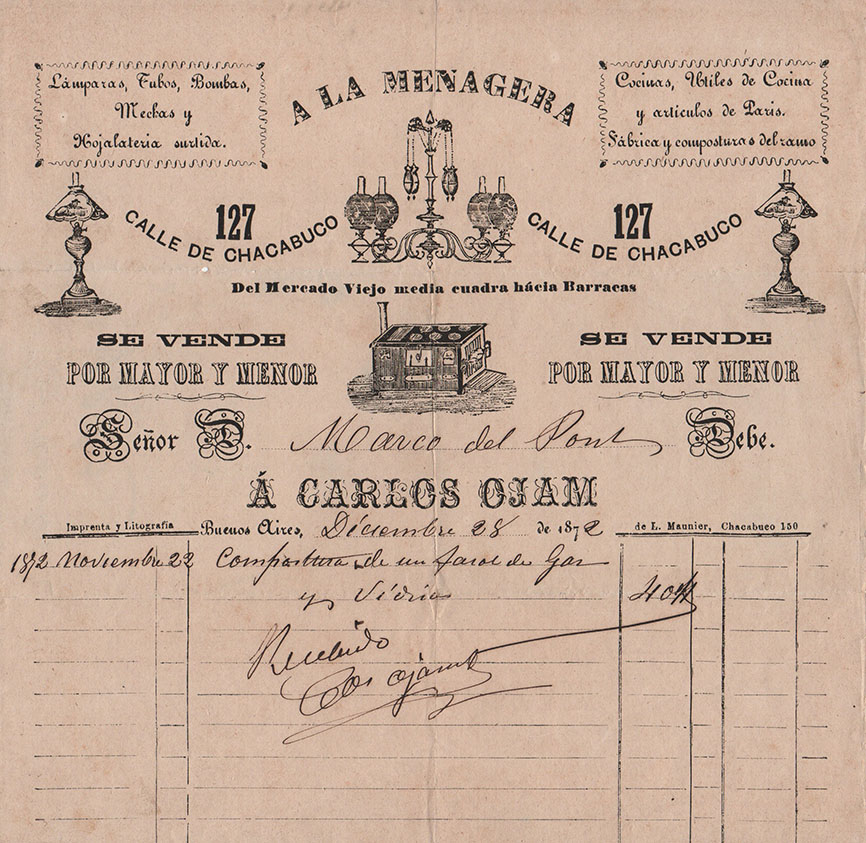 La más antigua, fechada el 10 de Marzo de 1860, emitida por la Carpintería Española, de Antonio Cabana. Entre las demás, de Corti Riva y Cia -una prestigiosa firma de efectos navales, pinturas, vidrios y ferretería, ubicada en pleno corazón de la Boca-, como lo indica al pie de su membrete. Otra, también de una casa introductora -en este caso, la Pinturería de Monserrat- y entre las restantes, de los comercios de Juan Blaquier, de Jacobo Menditeguy y Cía, y de Carlos Ojam, su casa llamada “A la menagera”, en alusión a la venta de menajes -artículos de uso doméstico, luces, hojalatería, cocinas y otros útiles-, ubicada “Del Mercado Viejo media cuadra hacia Barracas”.
