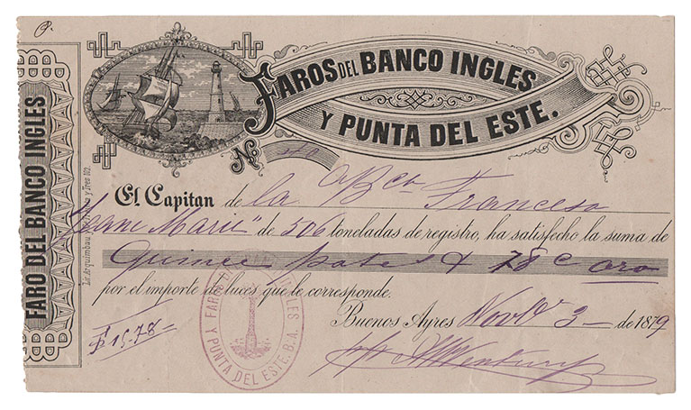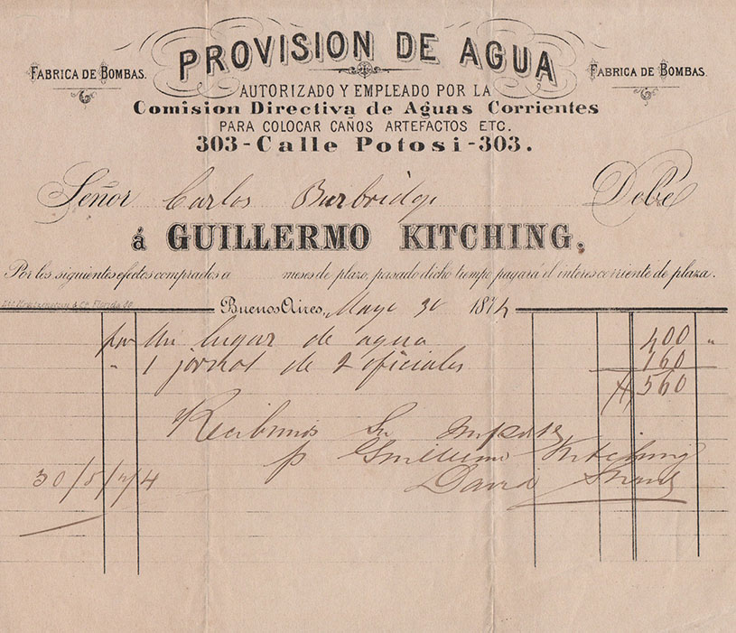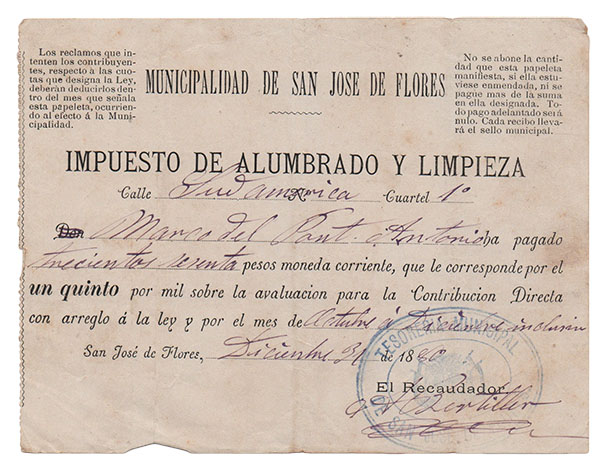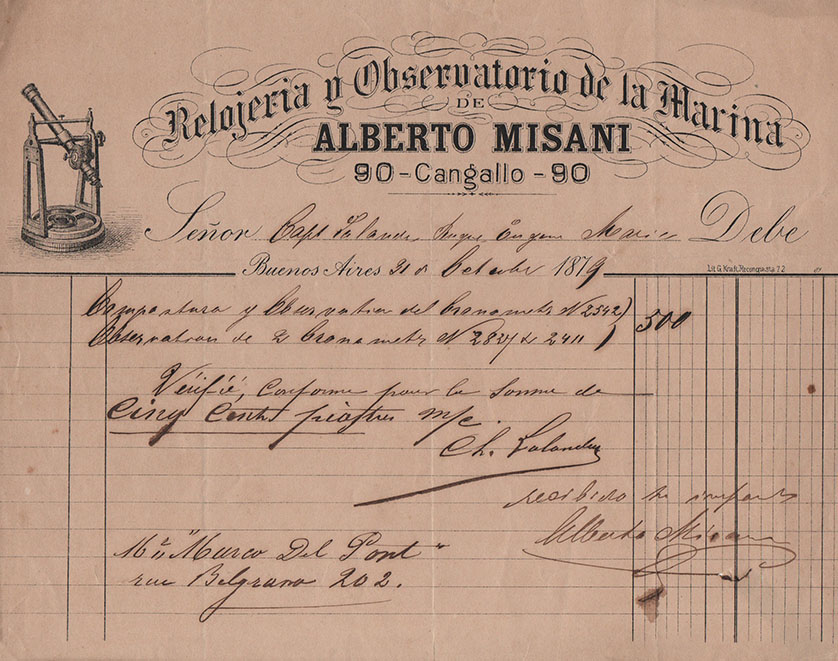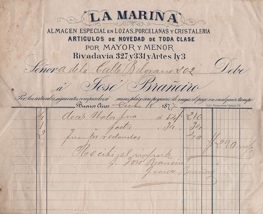También mencionamos un recibo emitido por el comercio de José Brañeiro, su “Almacén especial en lozas, porcelanas y cristalería” de nombre La Marina, con sus direcciones en Rivadavia 327 y 331, y sobre la calle Artes 1 y 3, siempre de Buenos Aires. Allí compró algunas docenas de platos y un par de fuentes redondas. Entre los más bellos, el membretado por Alberto Misani, titular de la “Relojería y Observatorio de la Marina”, ubicada en Cangallo 90.