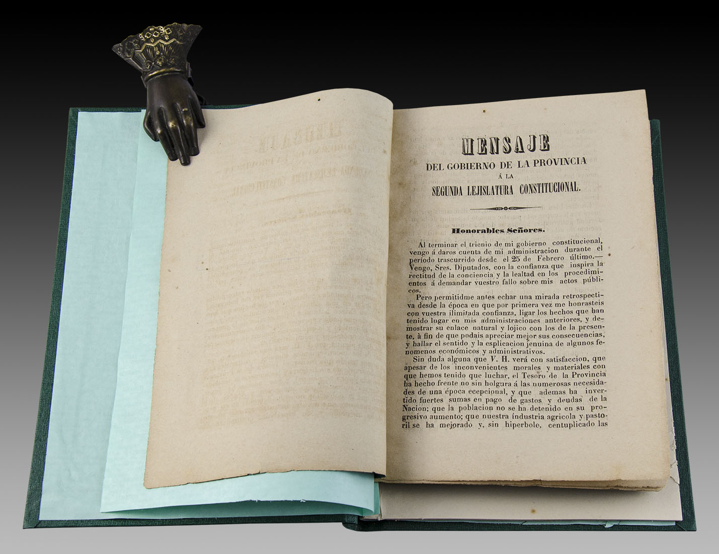 Conjunto de doce folletos que se inicia con el Mensaje del gobernador Juan Pujol a la Legislatura provincial, de 1859; todos reunidos en un volumen encuadernado en plena tela verde.