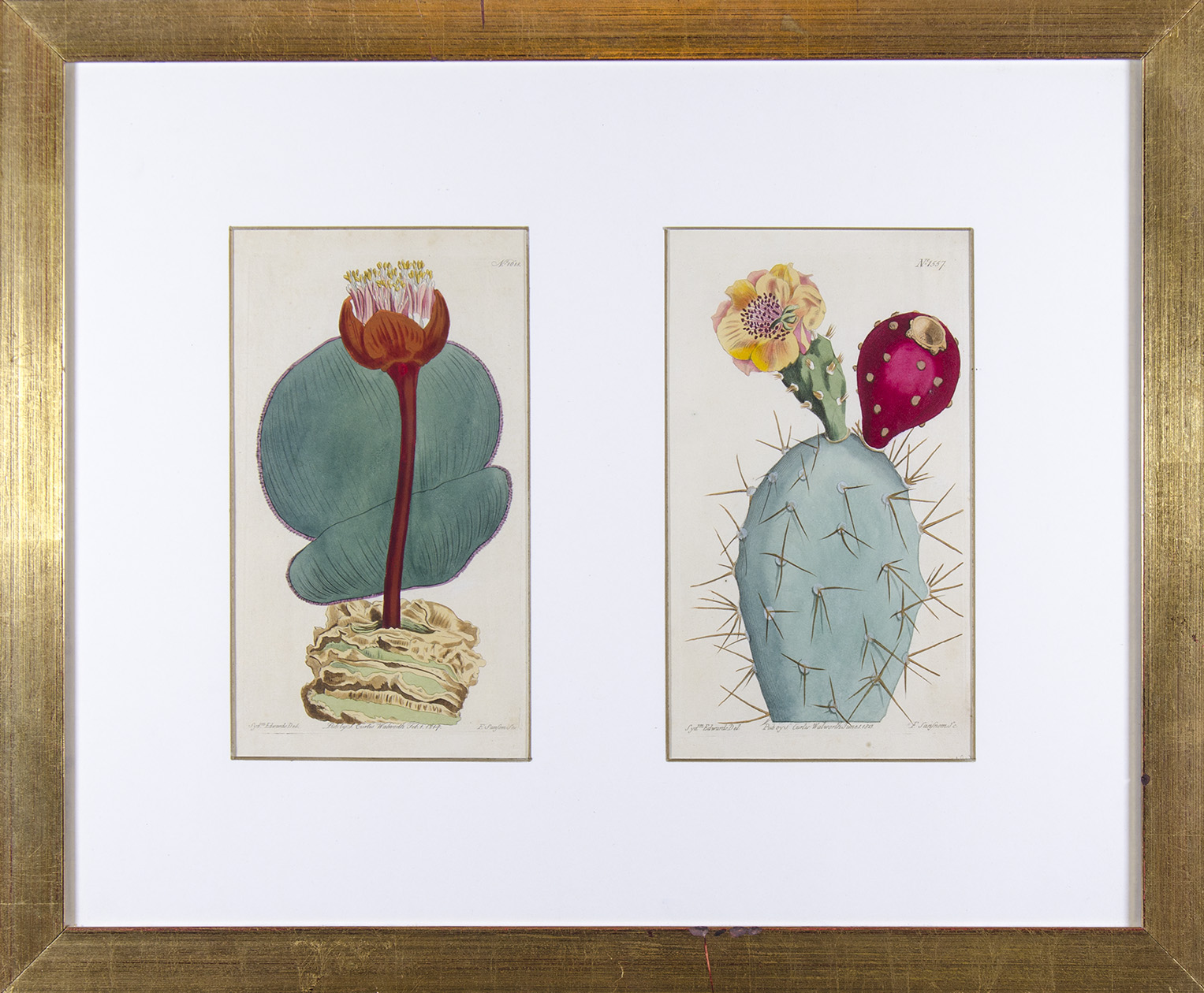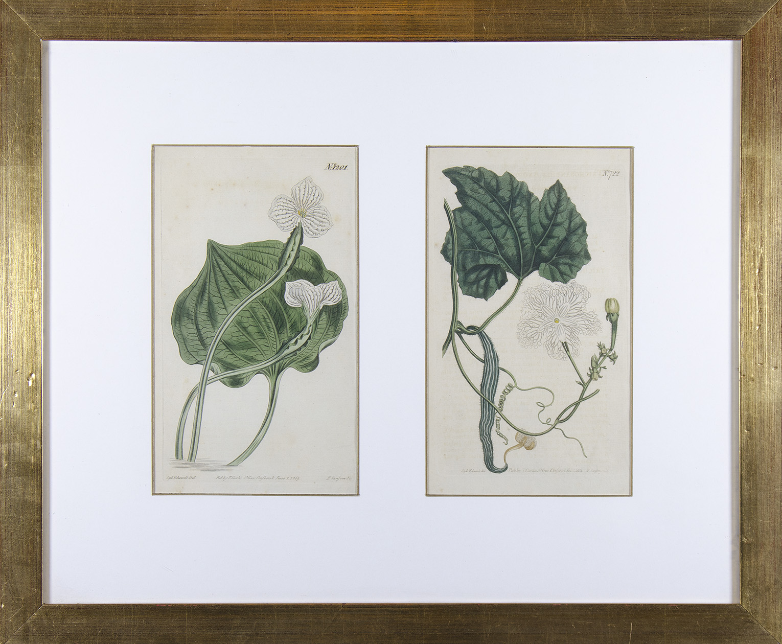 Cuatro preciosas ilustraciones botánicas, pertenecientes al libro Curtis’s Botanical Magazine, or Flower-Garden Displayed, (es decir, “Revista botánica de Curtis, o jardín de flores expuesto”) publicado en Londres en 1814. Dibujadas por Sydenham Teast Edwards (1768-1819) y grabadas por Francis Sansom.