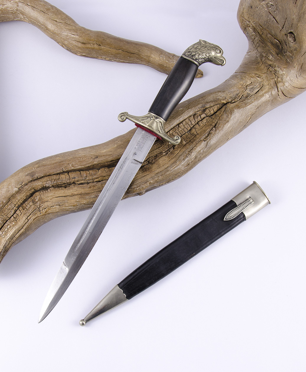 Atractiva pieza, en gran estado con su vaina de cuero y calces de metal. La empuñadura, de cornamenta pulida, lleva la cabeza de un águila en el pomo -emblema de aquella nación europea- y una defensa o cruz, también de metal, con curvas en los extremos a modo de S.