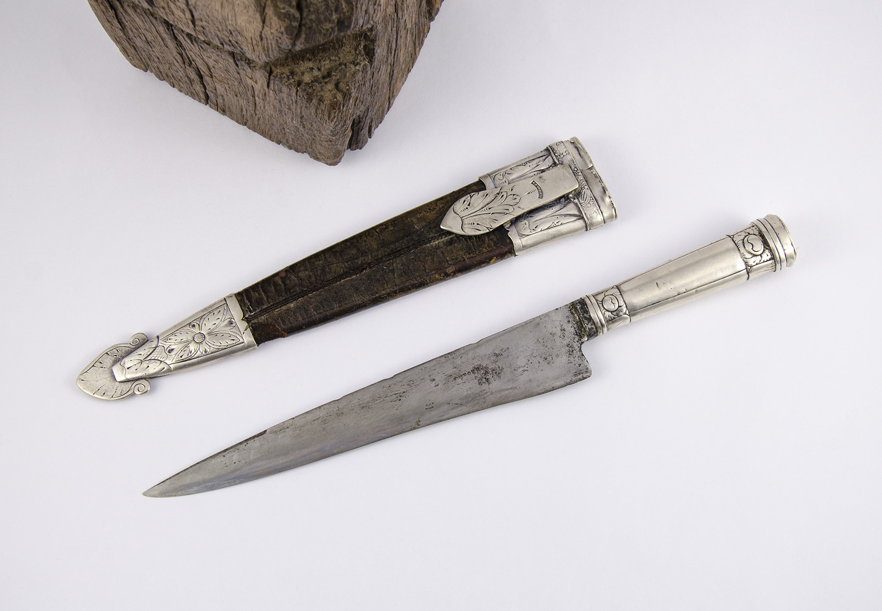 Importante cuchillo “picazo”, con su vaina de suela original y una muy atractiva platería con un detalle de interés para el coleccionismo: lleva un soaje en la vaina que no se repite en la empuñadura, y ambas partes exhiben el mismo punzón de autoría: A. D´ONOFRIO. Cuenta con una hoja Dufour, seguramente reemplazada, para darle más jerarquía a un cuchillo que bien se la merecía. Con iniciales de pertenencia (B. M.) grabadas a buril en la empuñadura y también, en la vaina con una fecha: 1922.
