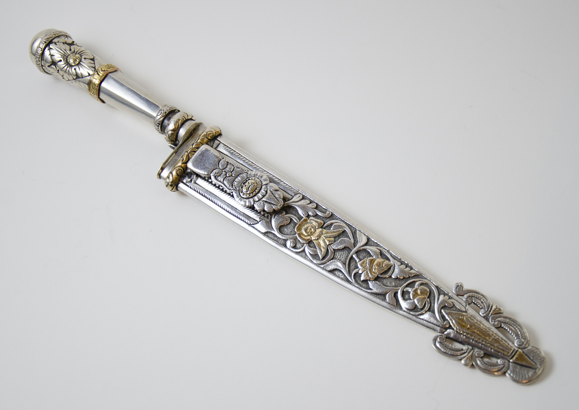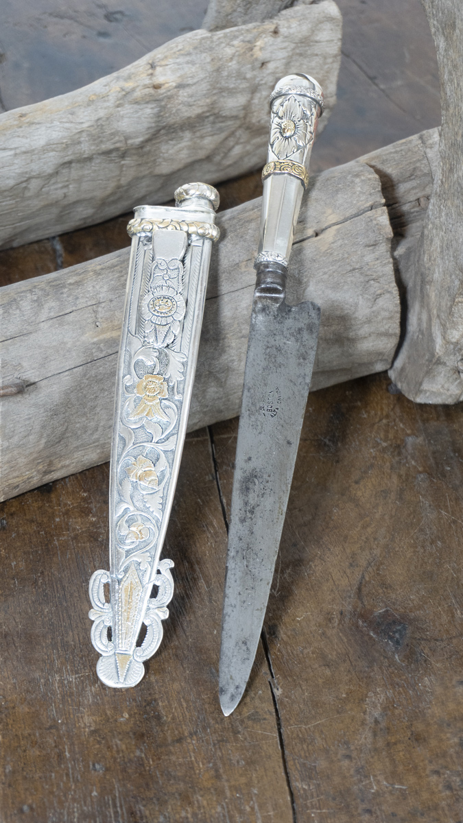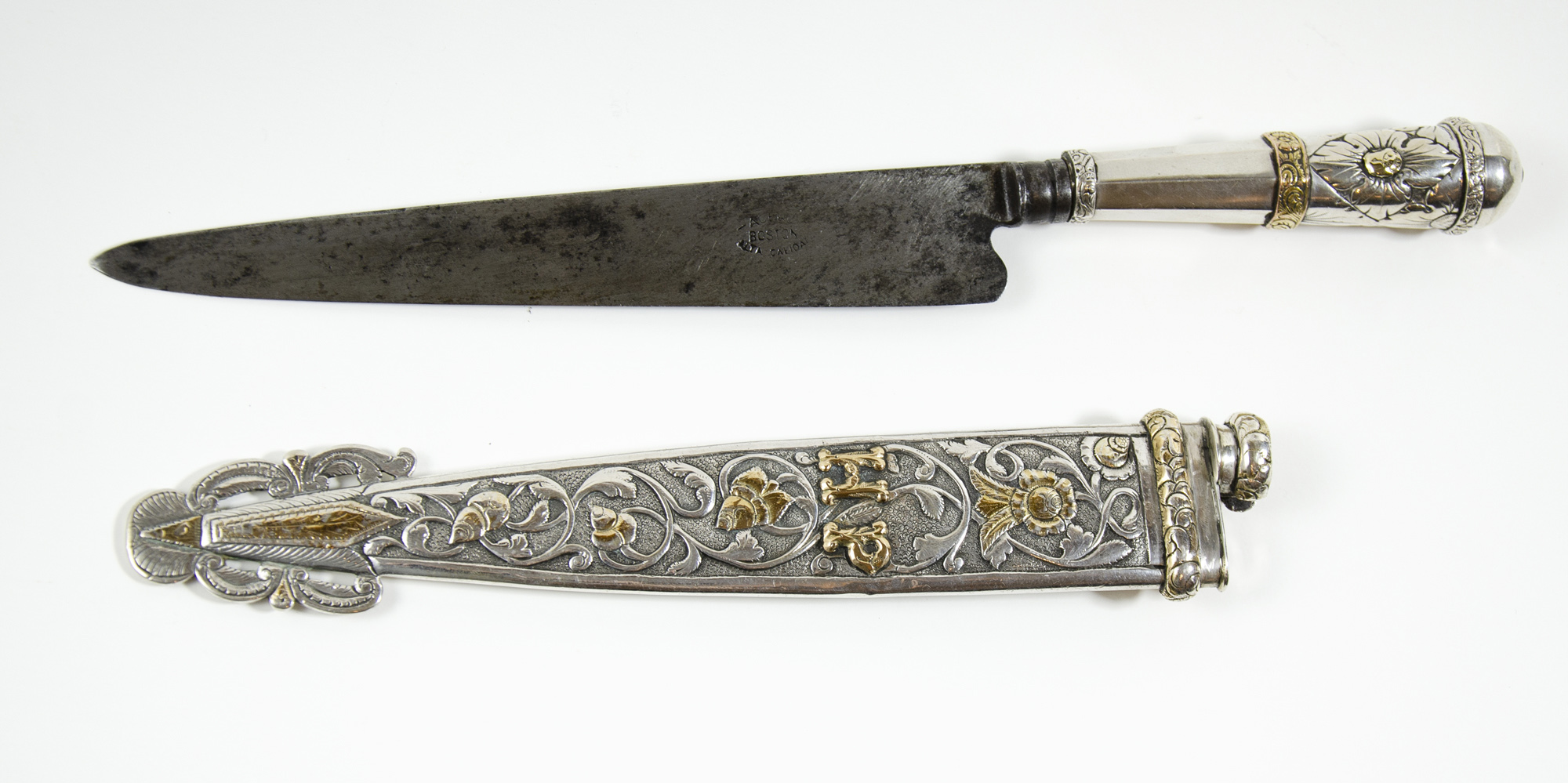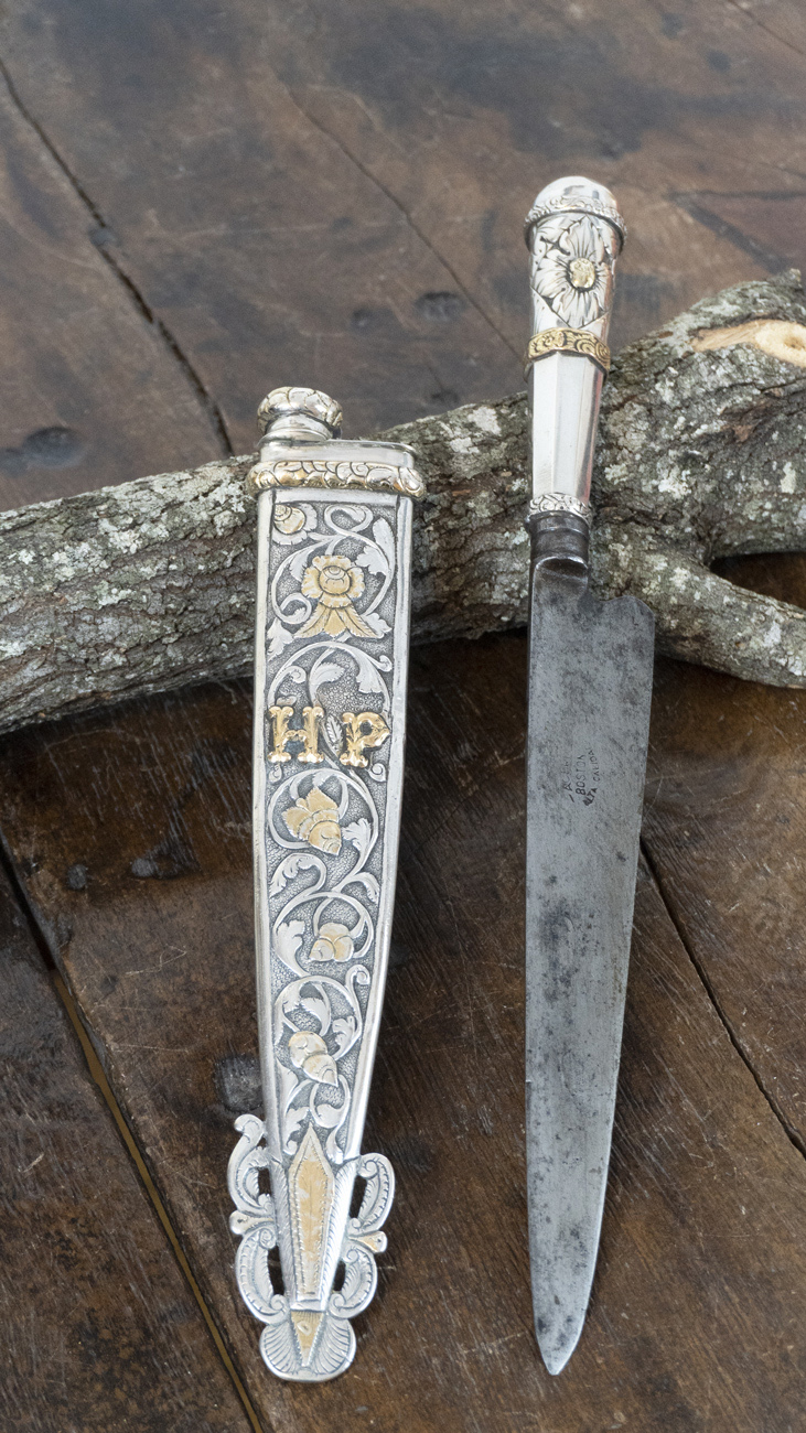 Importante cuchillo, realizado por un maestro del oficio. Así lo indican hasta los detalles más mínimos de esta pieza, como puede ser el diseño de la empuñadura, en el tramo distal de sección redonda y cincelada, y en el resto de la pieza, facetada y lisa. En la vaina, las ramas que la recorren en el cincelado forman roleos con hojas y flores, estas embellecidas por el diálogo de metales. Lleva cubrebotón, característico en los cuchillos de esta región cuando la hoja posee su botón redondo. Con iniciales de pertenencia “H. P.”. Otra sutileza que habla de las dotes artísticas de su autor: la asimetría lograda en la puntera.