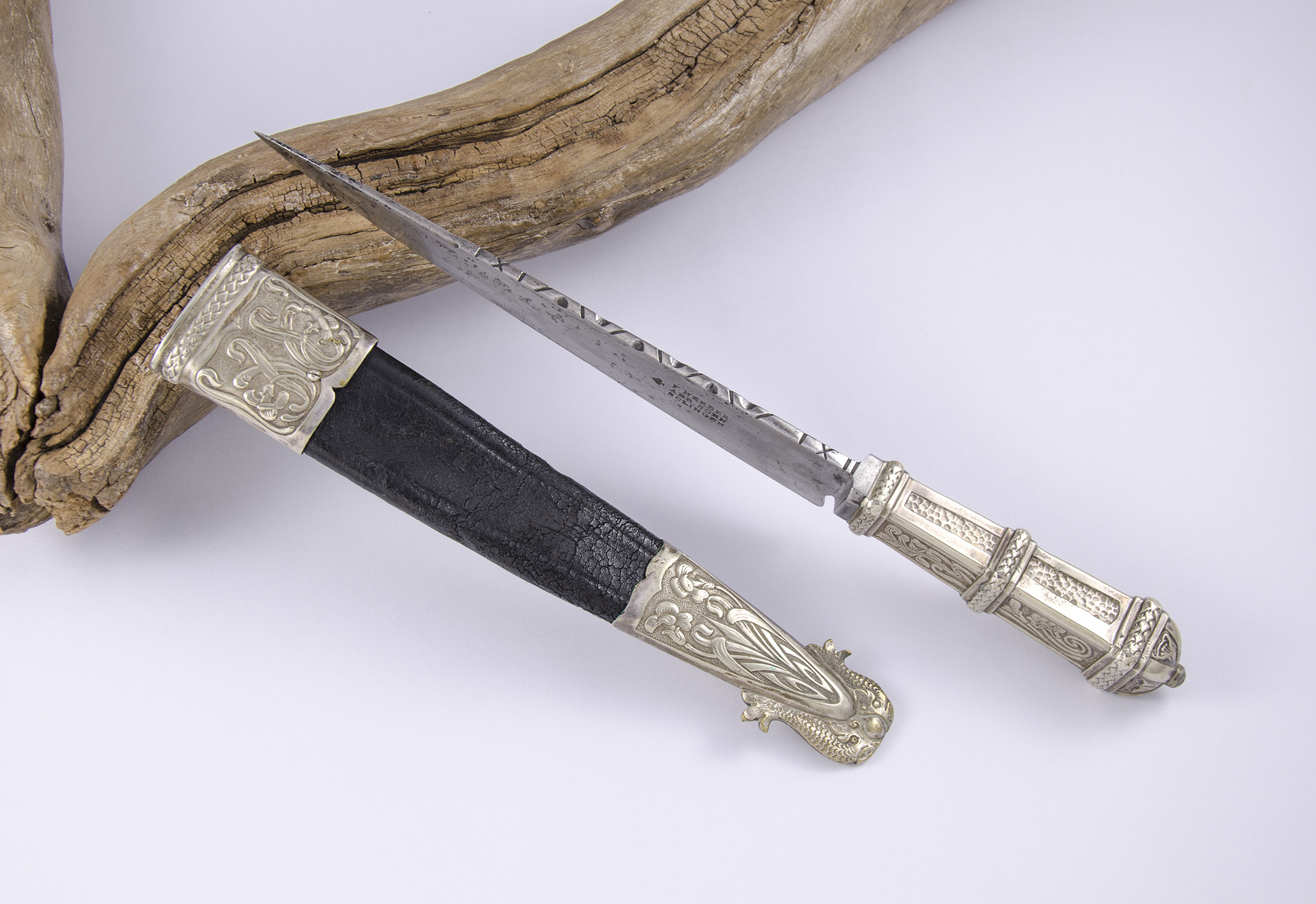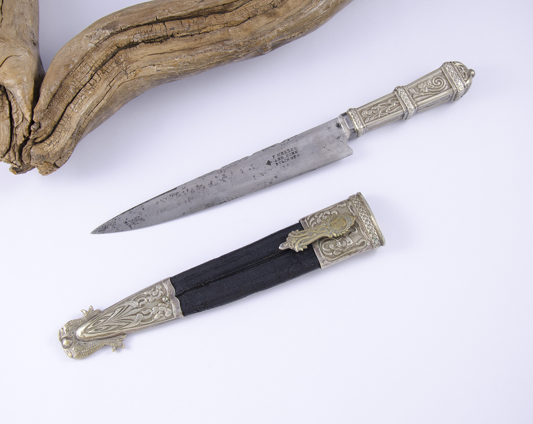 Fabricado en Alemania y de estilo criollo, en “un intento para captar el mercado argentino”, como lo indica con acierto Abel Domenech en su obra Del facón al bowie, pág. 158, estos cuchillos eran fabricados en metal blanco -llama la atención en el presente ejemplar, la traba, con un color distinto al resto de la pieza, aunque con un diseño exclusivo para nuestro país- y con una vaina de cuero, aquí la original.