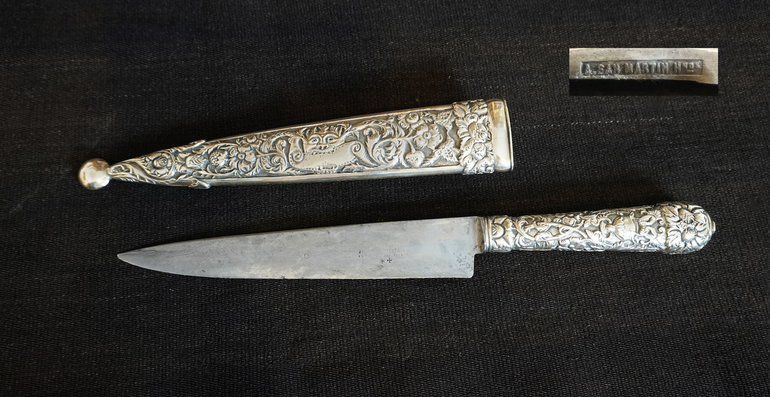 Excepcional cuchillo, decorado en su empuñadura y vaina por las labores de un gran cincelador, quien talló sobre el metal, ramas, hojas, flores y aves en un tupido follaje, un jarrón, y en el centro de la vaina, sobre una reserva tipo pergamino -destinada a grabar las iniciales de su dueño, no utilizada-, un mascarón. En la puntera, una esfera achatada y bruñida como la bocavaina. Punzón en la traba y la bocavaina: A. San Martín Hnos.