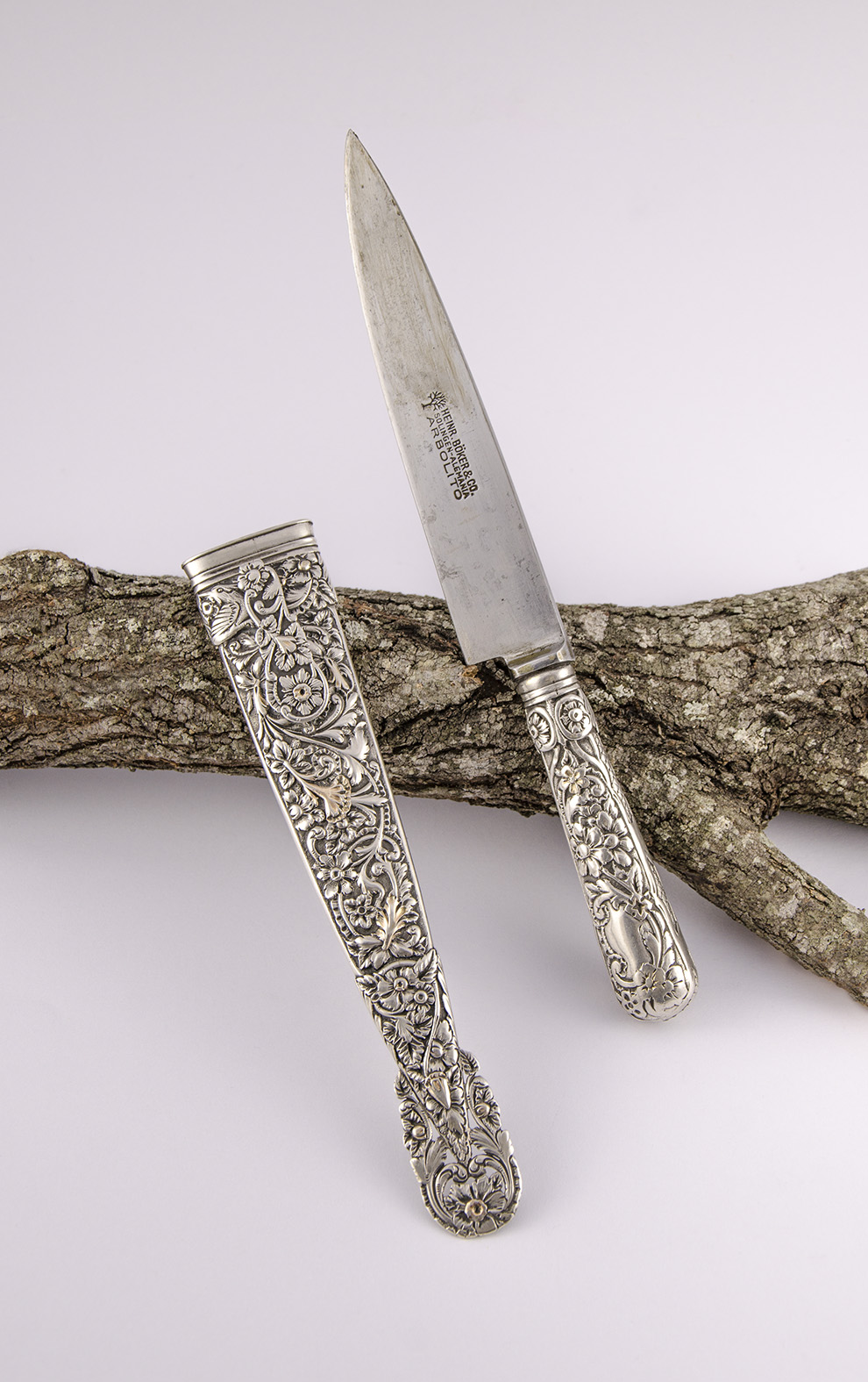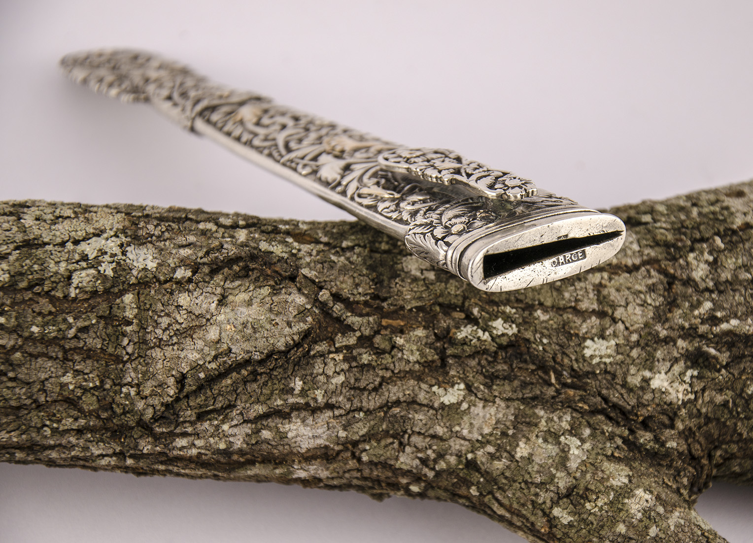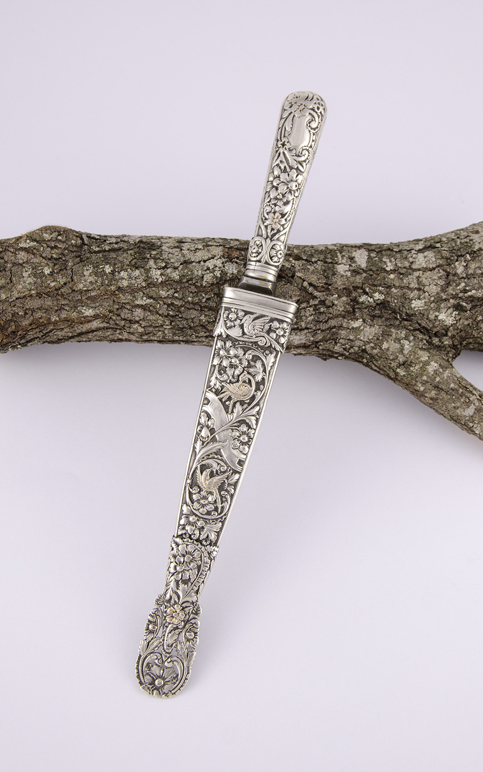 En el presente cuchillo, si tomamos cada centímetro cuadrado tendremos la posibilidad de observar su maestría; los detalles de un fruto, de una flor, de un ave en vuelo… Sin duda, aquel artífice inigualado disfrutaba con su arte y se concentraba en esas huellas sutiles para alcanzar su más alta expresión.