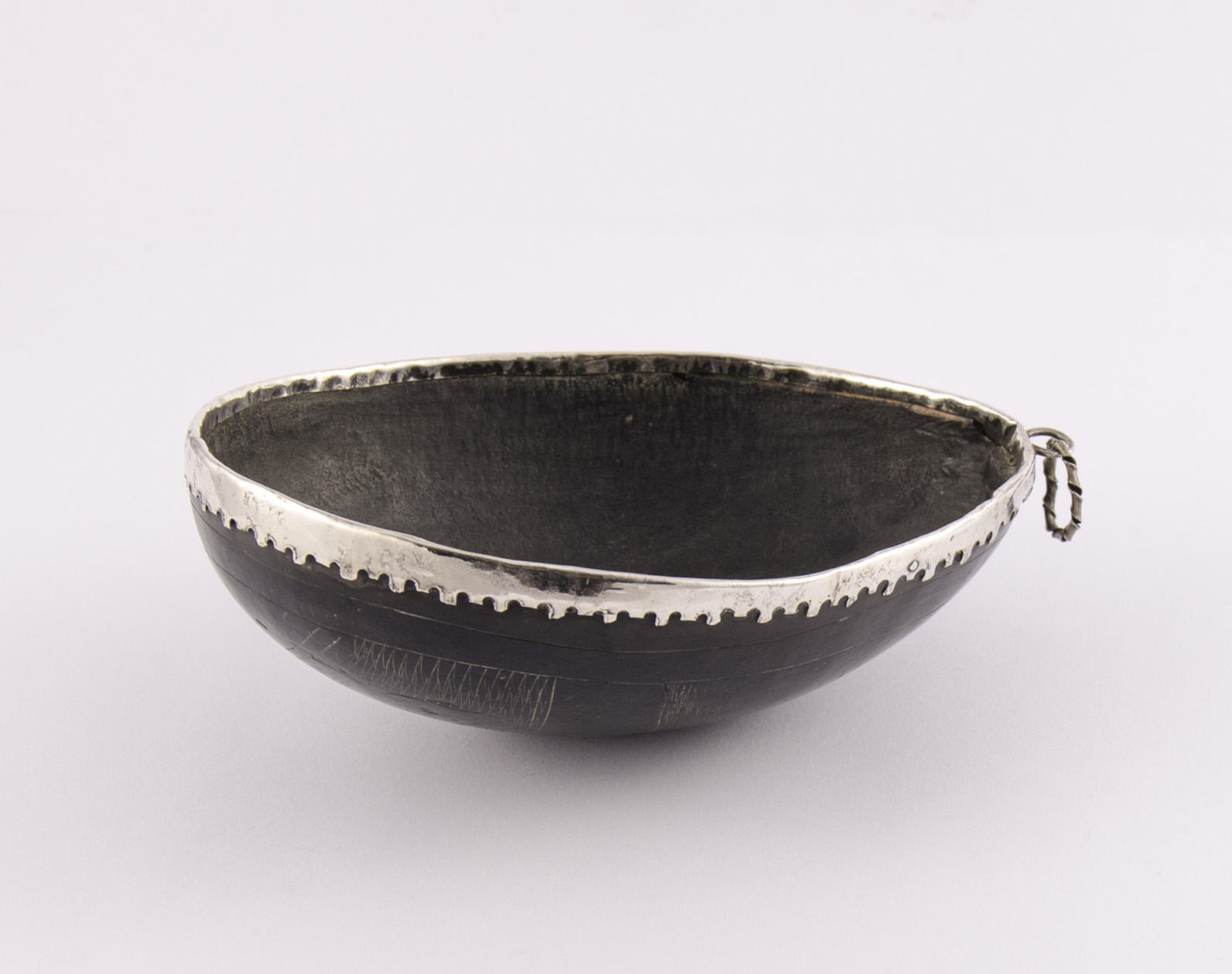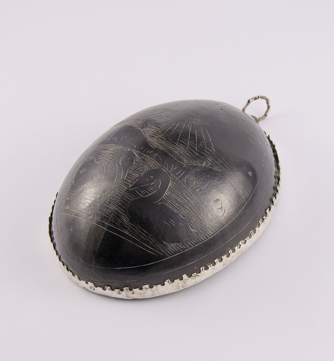 De superficie bruñida y pulida, presenta un paisaje acuático hecho a buril, con dos patos de cuello largo y en el horizonte un sol a pleno. El cocobolo fue además decorado con una guarda perimetral de plata, de borde dentado, la sostiene a lo alto una argolla, de la que pende otra.