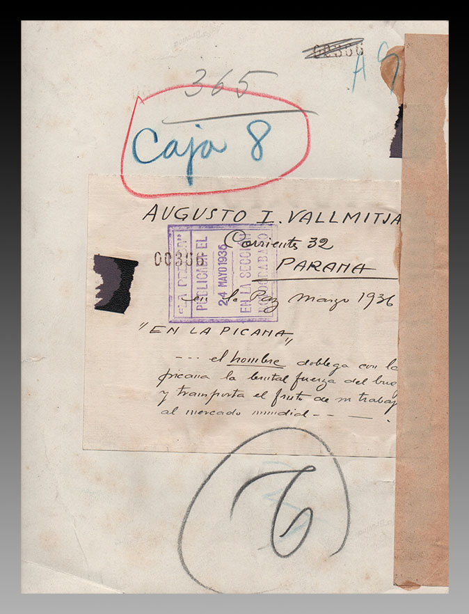 Fotografía vintage. Copia a la gelatina de plata, con margen blanco. Al reverso de la misma, sobre un papel pegado, se estampó un sello húmedo del medio gráfico con la indicación de la fecha en que fue publicada, 24 mayo 1936, y en forma manuscrita: AUGUSTO I. VALLMITJANA. Corrientes 32. PARANÁ”, su autor. Más abajo, el título original y el epígrafe: “... el hombre doblega con la picana la brutal fuerza del buey y transporta el fruto de su trabajo al mercado mundial”.
