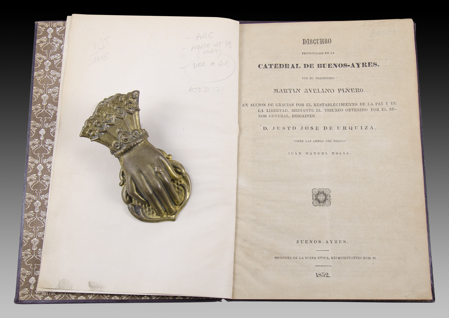 Discurso pronunciado en la Catedral de Buenos-Ayres por el presbitero (...) En Acción de Gracia por restablecimiento de la Paz y de la Libertad, mediante el triunfo obtenido por el Señor General Brigadier D. Justo José de Urquiza, sobre las armas del tirano Juan Manuel de Rosas. Buenos-Ayres. Imprenta de la Nueva Época. 1852.
