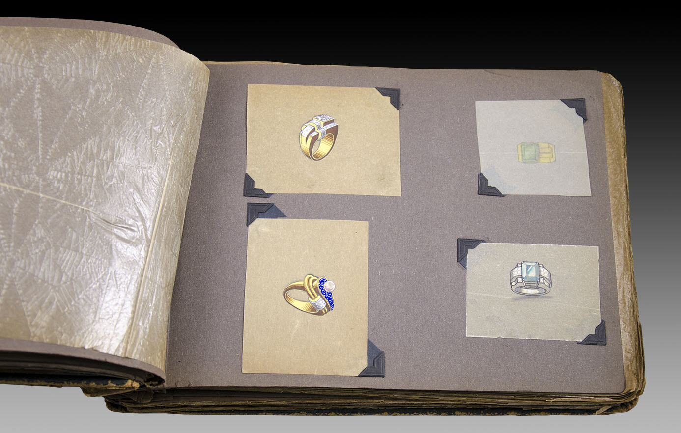 Se trata de un muestrario de diseños originales de joyería; algunos modelos llevan la firma "Elena", sin lugar a dudas, una diseñadora de orfebrería con buenas dotes artísticas. Se advierte además, un sello con indicación de una firma de joyería: Joyas Warny. Santa Fe 1200. (Buenos Aires)