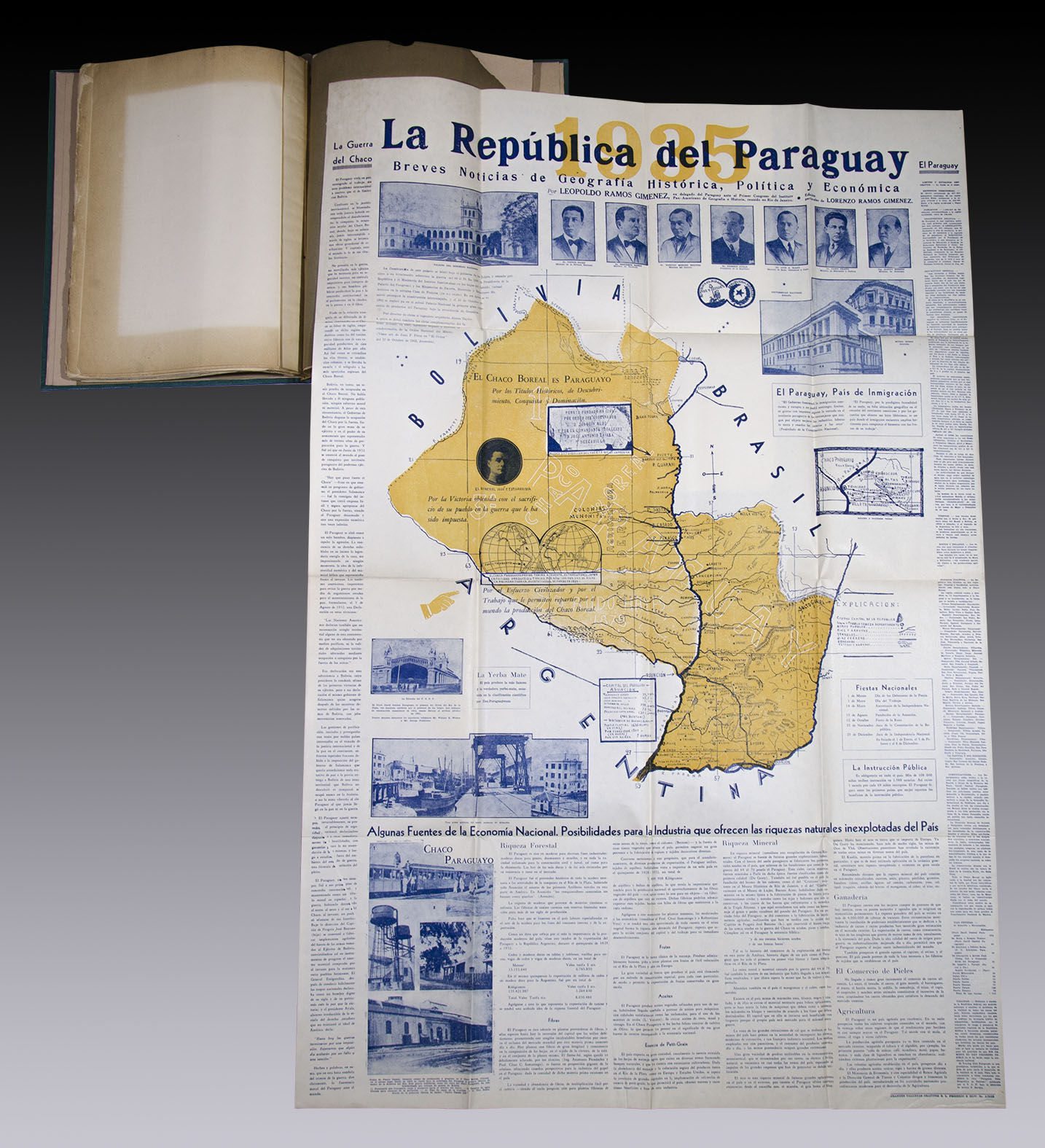 En Folio (37 x 29,5 cm), 2 pp + 7 láminas (3 de ellas con fotografías) + 15 planos impresos y 1 plano adicional plegado de la República del Paraguay (1935). Encuadernación en plena tela, conservando sus tapas originales, con pérdidas marginales. Ejemplar en general, en buena forma.