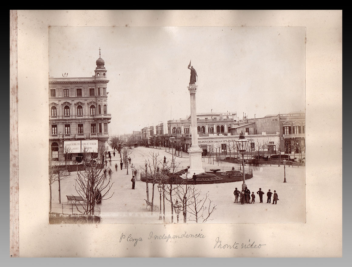 Fotografía vintage. Copia por contacto a la albúmina. Obra en tono sepia. Negativo de vidrio intervenido en su borde inferior con leyendas sobre el autor, la descripción del tema y el número de negativo. Papel simple peso. Medida: 17,7 x 22,1 cm.  Copia montada sobre cartulina blanca de época -medidas: 24 x 29,2 cm-, con la siguiente fotografía, de la plaza Independencia de Montevideo, pegada al dorso. Obra en buen estado. [1]