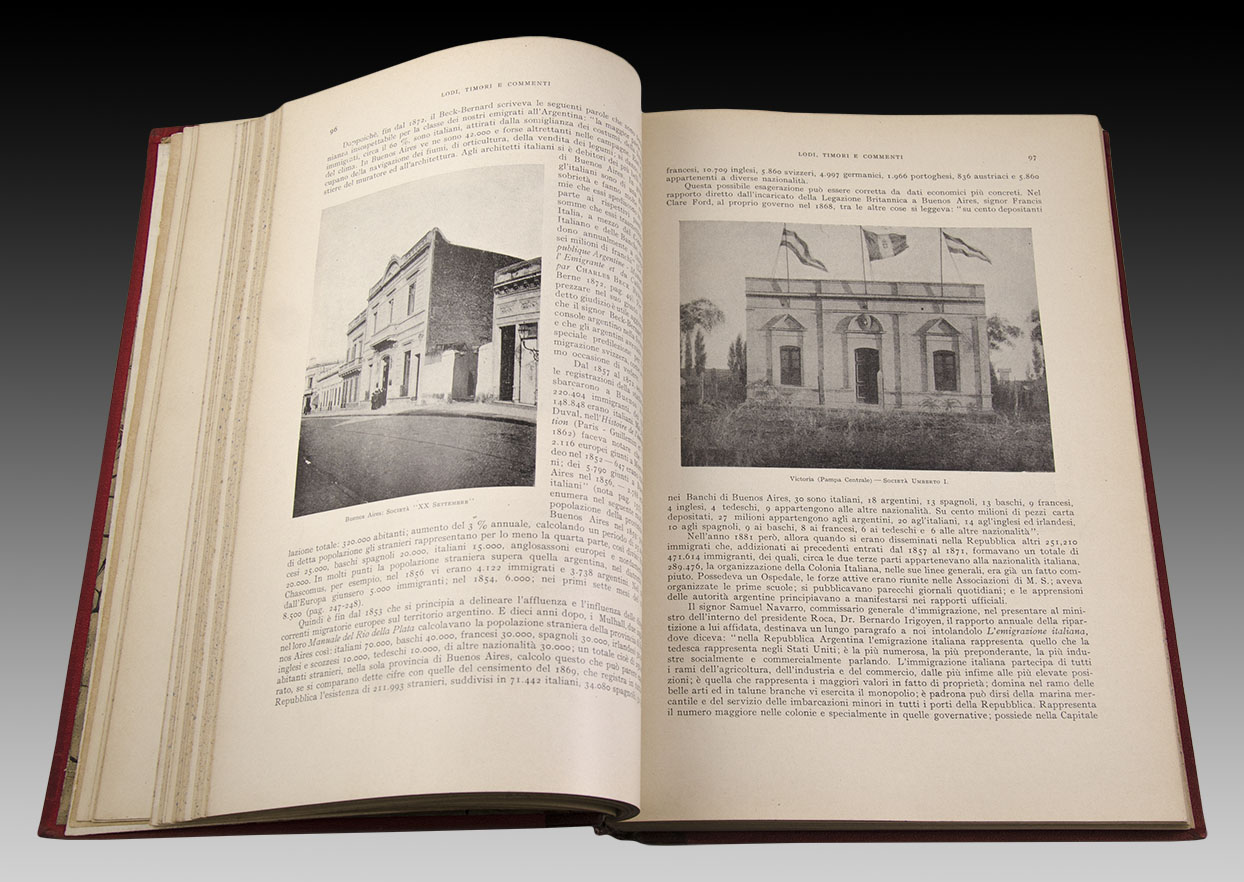“El trabajo de los italianos en la República Argentina, desde 1516 hasta 1910: estudio, leyendas e investigación” se titula este profundo volumen escrito en italiano por Emilio Zuccarini. Su tarea fue ardua, registrar tres siglos del paso y accionar de la más numerosa e influyente inmigración que haya tenido nuestro país, la italiana. Como leemos también en la portada, fue dedicada “A la Nación Argentina conmemorando el Primer Centenario de la Independencia”. El Teatro Colón, el Congreso Nacional, la Catedral de La Plata -entre un sinfín de obras arquitectónicas a lo largo y ancho del país-, obras de ingeniería, artísticas, o los italianos y descendientes de aquellos más trascendentes de nuestra historia se ven representados en este grueso volumen. Sin lugar a dudas los italianos, con su conocimiento, su ciencia, su arte y su tenaz mano de obra son un eslabón fundamental en la forja de nuestro país. Se erige este libro, pues, como el más cabal, profundo y completo testimonio de aquello.