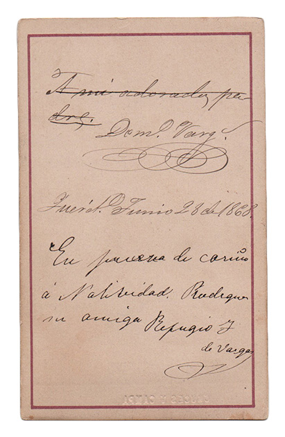 En este punto debemos transcribir la doble dedicatoria al dorso. En la parte superior y letra manuscrita en tinta negra indica: "A mi adorado padre (texto tachado) Daniel Vargas. Querét(aro). Junio 28 de 1868". Mientras que la esposa reutiliza la misma tarjeta de visita y escribe abajo: "En prueva (sic) de cariño á Natividad Rodríguez su amiga. Refugio J. de Vargas"