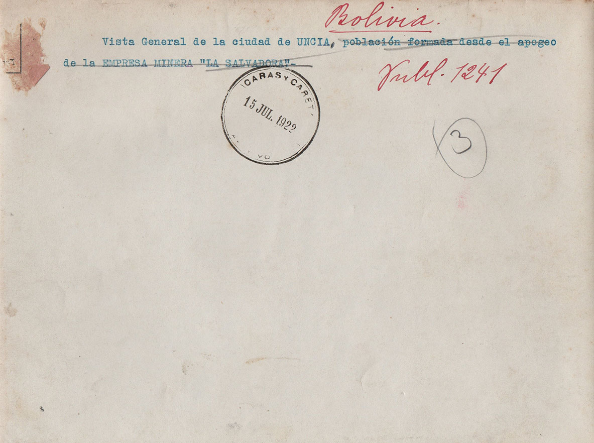 Gelatina de plata. Virada al sepia. Sin márgenes blancos. Información al dorso de la obra y sobre el borde superior. Mecanografiado en azul: "Vista General de la ciudad de UNCIA, población formada desde el apogeo de la EMPRESA MINERA "LA SALVADORA." Luego en tinta roja y letra manuscrita de la administración de la revista: "Bolivia" y "Publ. 1241" Se aprecia el clásico sello húmedo formato redondo y en tinta negra: "Caras y Caretas / 15 Jul. 1922 / Archivo". Finalmente, en lápiz grafito el número: "3". Medidas: 17,8 x 23,5 cm. Obra fotográfica en excelente estado de conservación.