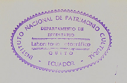 Gelatina de plata -20,3 x 25,7 cm- con márgenes blancos. Papel simple peso brillante. Al dorso sello húmedo en tinta azul: “Instituto Nacional de Patrimonio Cultural - Departamento de Inventario - Laboratorio Fotográfico. Quito - Ecuador.”
