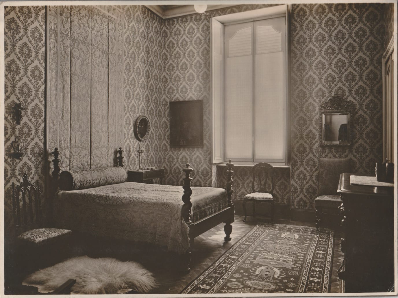 Objeto con alma. Perteneció a Eduardo Schiaffino, dispuso de él cuando se encontraba en Torino, Italia. Hemos localizado una fotografía digitalizada que nos muestra el dormitorio con el marco de madera, estucado y dorado, y su espejo a la derecha. Ex colección Eduardo Schiaffino. Ex colección Norah Borges. Ex colección Miguel de Torre Borges.