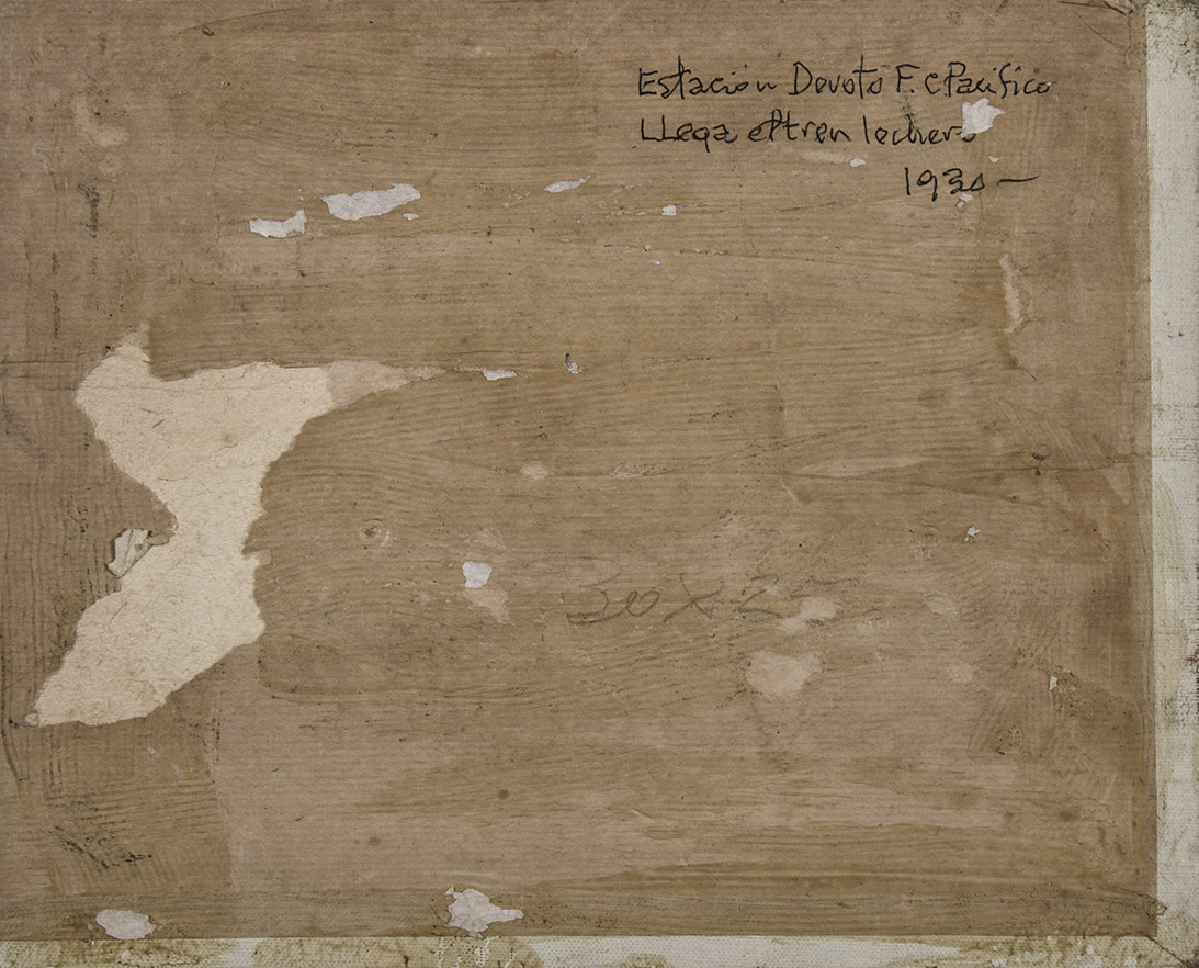 Tres coches, dos tirados por caballos y un Ford A entre ambos, son cargados con los tarros de leche que acaban de llegar en un tren desde el interior de la provincia para ser distribuida en la ciudad. Delante de ellos un peatón lleva cuatro de estos recipientes. Instantánea de una Buenos Aires de casi un siglo atrás, pintada por este joven artista en los inicios de su carrera.