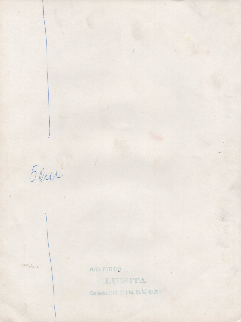 Obra vintage. Gelatina de plata en tono blanco y negro, sin soporte secundario, firmada por su autora. Medidas: 23,8 x 17,9 cm. Al dorso, publicidad en sello húmedo: "Foto Estudio Luisita - Corrientes 1373. 2° L. Int. Bs. As. 40-2519". Obra en digno estado, con pequeñas manchas marginales.