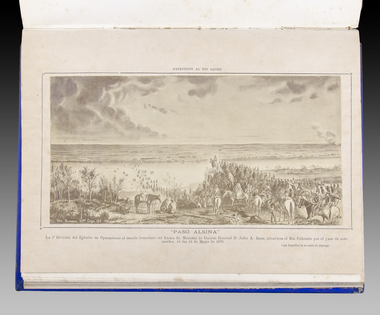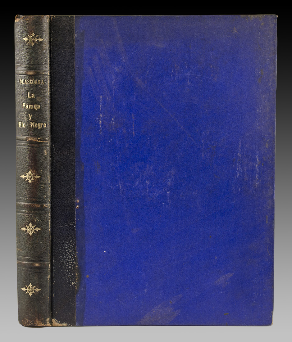 En 4° mayor (30 x 22,3 cm), LXXXIII + 280 pp. Encuadernación original con lomo de cuero, florones y títulos dorados. Incluye varios grabados y una foto original del Paso de Alsina (fotografía de Fermepin Hnos sobre una obra pictórica de Olascoaga) montada sobre la Pág. 61 con título y epígrafe impresos, así como un gran plano del Territorio de la Pampa y Río Negro, plegado. Obra en buen estado. Roberto Ferrari [“Publicaciones argentinas con fotografías originales (1855 - 1900)”] lo colaciona con el núm. 70 e indica: “aparentemente la fotografía se utilizó para completar ejemplares incompletos”.