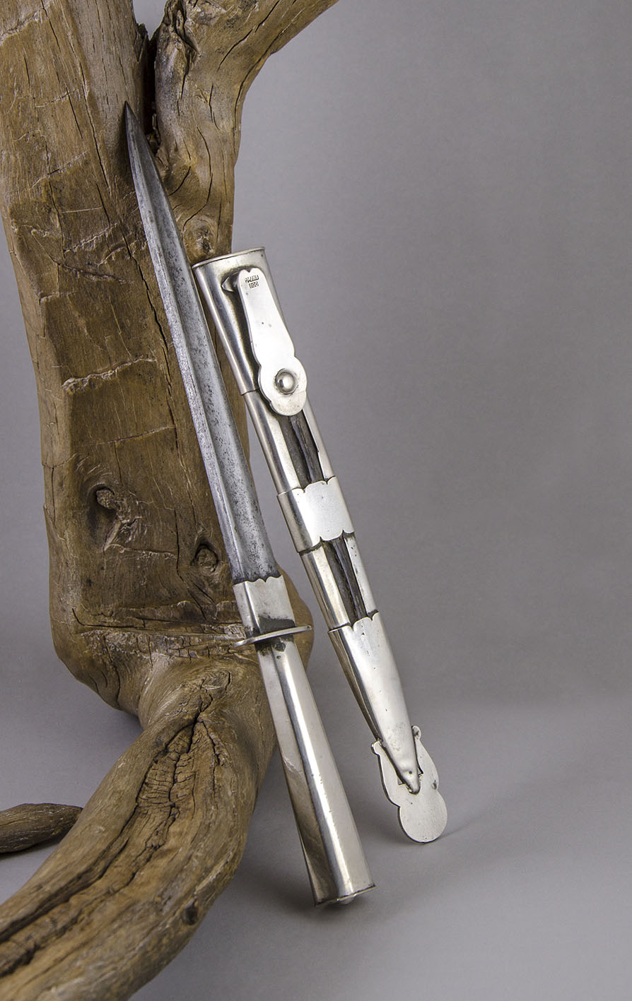 Empuñadura lisa y facetada con su pomo también liso y plano, diseño que se vincula con la vaina, de suela, decorada con el brocal, la puntera, el soaje, las costillas y el gancho o traba -donde se encuentran los punzones de autoría (PIAZZOLI) y de título de metal: 800-, todo liso y con pequeños detalles en el calado de los bordes de cada pieza, sutileza que permite ganar en la composición del conjunto, quitándole rusticidad.