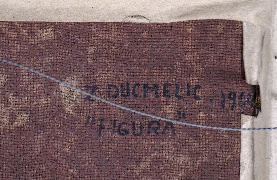 La frontalidad y estatismo de la figura femenina nos refiere a una pintura antigua sin llegar al primitivismo ni a la cita erudita... Su pelo está recogido y cubierto por una cofia, subrayando la forma oval del rostro, que es casi una máscara. Muestra la palma de una mano, mientras que la otra, elevada, sostiene una vara. Todo se torna metafísico en el mundo simbólico de Dučmelić. Las perfectas líneas verticales manifiestan la búsqueda de una perfección formal, no carente de irrealidad. El vestido, ceñido y corto, despliega una textura geométrica de variados colores. El geometrismo del traje se repite en el recuadro del ángulo superior derecho, que, unido a la vara que sostiene la mano, conforma una especie de cartel o banderín. A su vez la forma de esta cuadrícula refiere al perfil de su propia cabeza, como un extraño reflejo. Como describe Rafael Squirru en el catálogo para la muestra del 2001 en el Museo de Arte Moderno, “Toda su obra está signada por el misterio. Impecable en su factura pictórica y dibujística, sus imágenes parecen evocación de mundos perdidos y sin duda recordados por su rico subconsciente. Se trata de una pintura de gran refinamiento donde rostros, breves figuras de seres humanos o de animales, sugieren destinos tan maravillosos como el del propio Zdravko Ducmelic”. En sus figuras hieráticas persiste la atemporal idea del arte y lo sagrado.