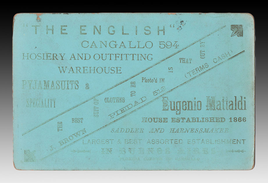 Estamos frente a una inusual obra fotográfica del siglo XIX donde, utilizando el popular formato "Portrait Cabinet" de la época, se promocionan tres empresas, "The English" en en Cangallo 594, y las tiendas de J. Brown en Piedad 518 y de Eugenio Mattaldi en Florida esquina Cangallo, las tres de la ciudad de Buenos Aires. La imagen fue realizada por el aficionado avanzado Adrian Lundstrom y nos muestra un elegante caballero en su oficina de trabajo, rodeado de varios libros de contabilidad y donde la gran caja fuerte a doble puerta se convierte en todo un símbolo de riqueza.