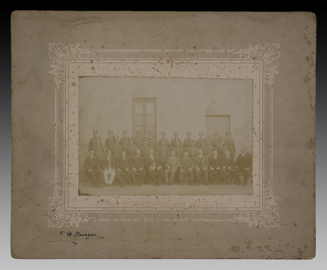 En el octavo registro, un destacamento policial posa sobre el frente de dos construcciones contiguas, una a la izquierda con su pared revocada y la otra con ladrillos a la vista. Colocando sentados -sobre elegantes sillas Thonet- y en primer plano, a los tres jefes o autoridades vestidos de civil, dos de ellos con botas de montar. Atrás de los mismo desplegó a los demás efectivos, siete policías en marcial formación y con sus uniformes reglamentarios, quepis y grandes sables. Todos los hombres lucen bigotes a la moda. El registro fue realizado en un frío y ventoso día de invierno.