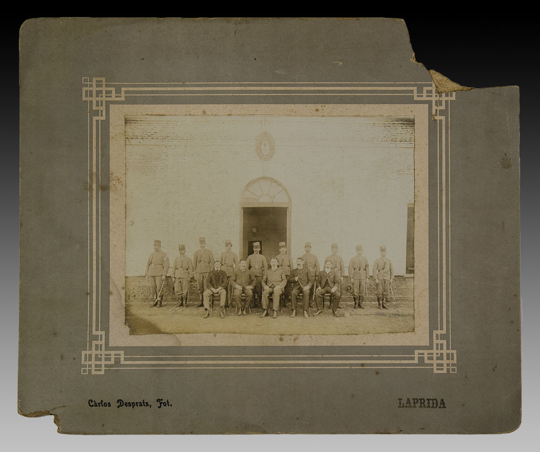 La quinta fotografía corresponde al conocido fotógrafo Carlos Desprats de Laprida (Buenos Aires) y fue realizada frente a la comisaría de aquella localidad. Desprats organizó aquel simétrico retrato grupal, colocando al frente y en el centro del conjunto, a cinco funcionarios de civil sentados sobre sillas Thonet. Detrás de los mismos se alinean y en posición de firmes diez policías uniformados de distintos rangos, con sus sables. El edificio policial ostenta sobre la puerta el clásico escudo de chapa de la institución y el frente es de ladrillos a la vista. También la vereda está construida de ladrillos. Hacia 1928 el Anuario Kraft nos informa que Laprida contaba con dos profesionales de la fotografía, ellos eran Norberto Desprats y José Ferri.
