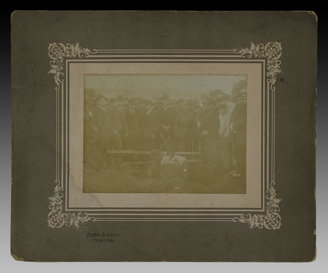 En la tercera imagen, un grupo de individuos -incluidas las fuerzas policiales- posa frente al cuerpo del occiso, extraído de su tumba, donde seguramente fue ocultado después de su muerte. La cuarta imagen, también realizada por Bonazza en exteriores; nos muestra al frente, una construcción de material con una gran cantidad de personas reunidas -incluso más de una docena de hombres parados sobre su techo-, donde se destaca la participación de las fuerzas policiales, uno montado y otros dos que uniformados custodian la puerta de la edificación.