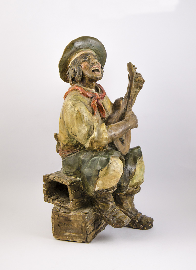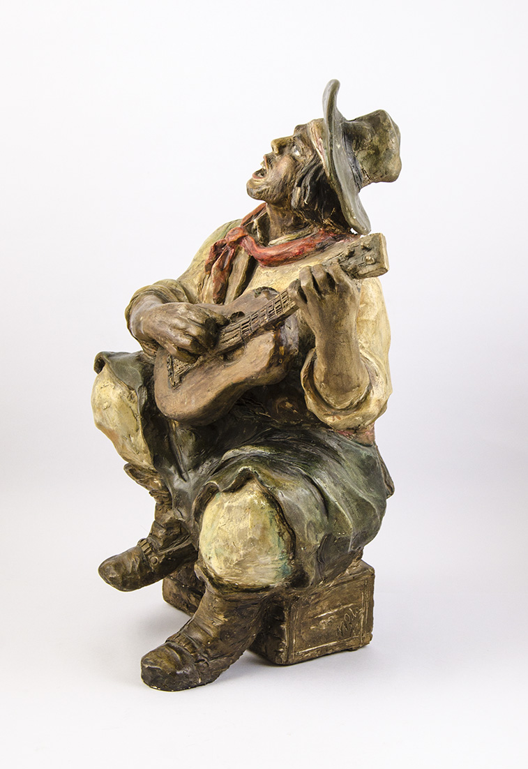 La figura del gaucho cantor -o payador- fue recreada por el artista -para nosotros, no identificado- con todos sus atributos. Nos referimos, obviamente a la guitarra, al sombrero de ala ancha con una vincha que sostiene sus largos cabellos. El personaje lleva un cuchillo a la cintura y viste camisa, pañuelo al cuello, chiripá, calzoncillo y botas. Ejecuta la guitarra mientras entona un tema; lo hace sentado sobre un par de maderas.