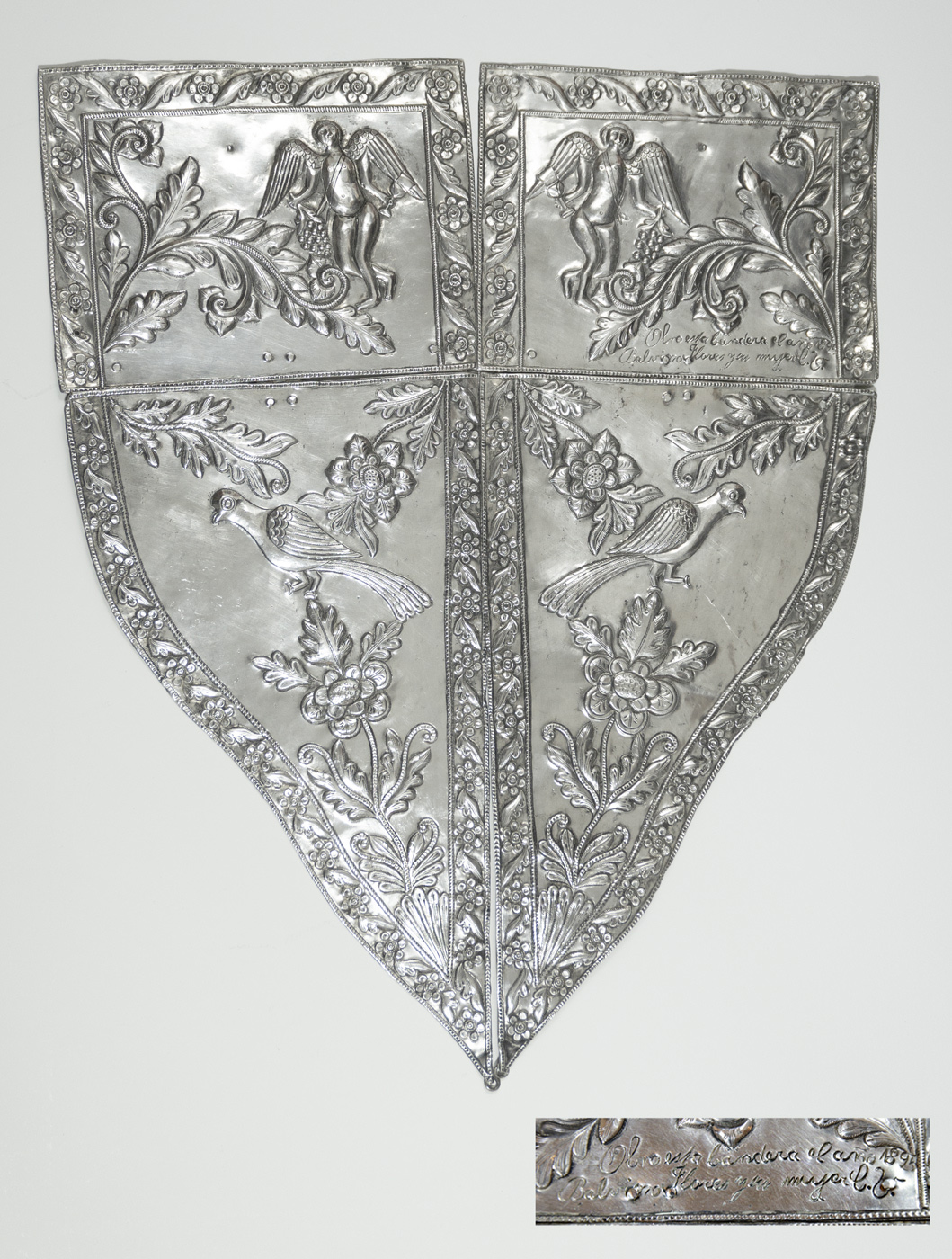 Excepcional pieza religiosa formada por cuatro partes en forma de banderín, realizada con una notable calidad artística. En uno de los tramos, la leyenda “Obro esta bandera el año 1895 Balvino (sic) Flores y su mujer C. S.”. Como recursos técnicos, el orfebre martilló el metal, lo repujó y cinceló, y ahora cuenta con pequeñas bisagras (posteriores) que lo llevan a su forma original, con articulación entre ambas partes por lado.