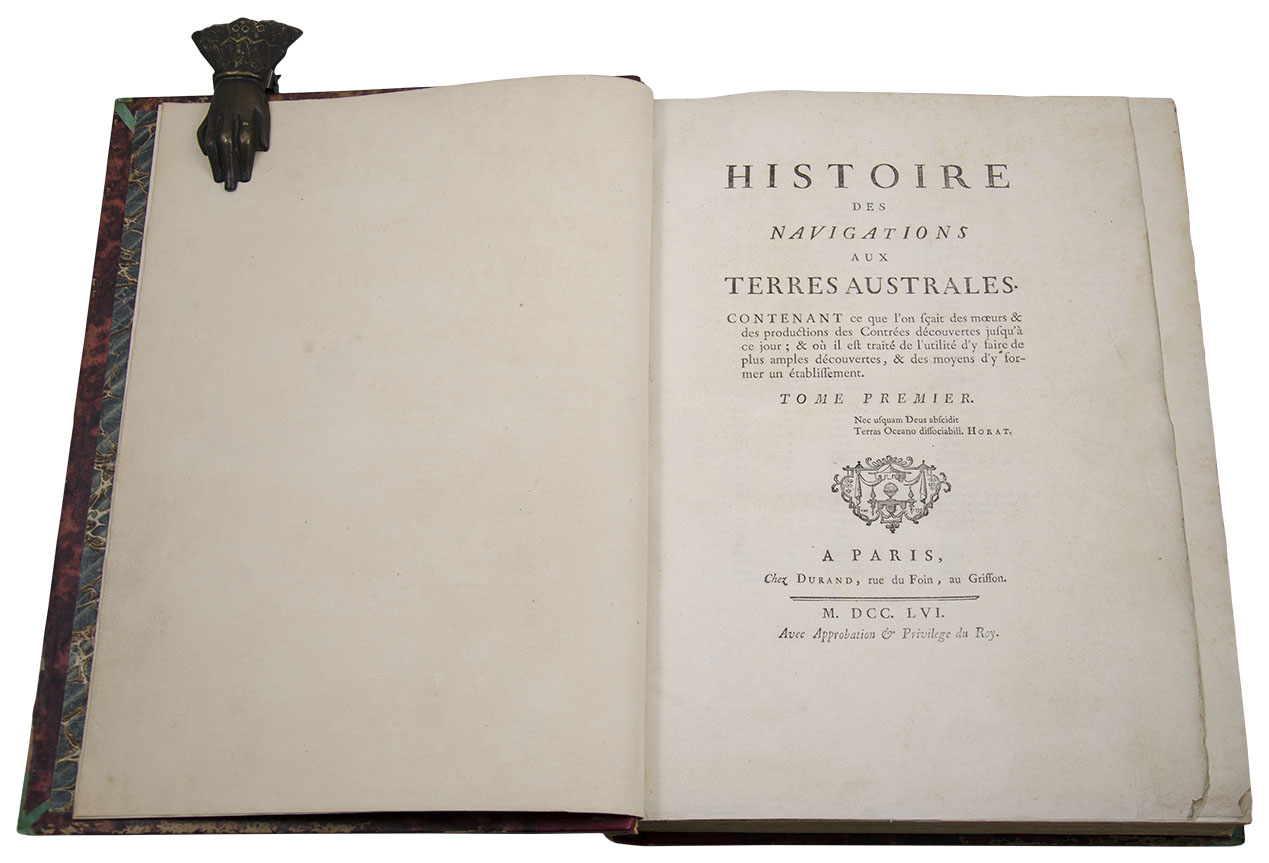 Brosses (1709 - 1790) reúne en esta obra capital, una de las más importantes, las primeras exploraciones sobre el Pacífico Sur, con los descubrimientos de los holandeses en Australia, siendo el primero que estableció una división geográfica de Australia y Polinesia. Incluye entre otras, las expediciones de Magallanes, Drake, Schouten y Tasman. Emprendió esta tarea a solicitud de su amigo Buffon, y por sus grandes contribuciones, Charles de Brosses fue una de las figuras más destacadas de la época.