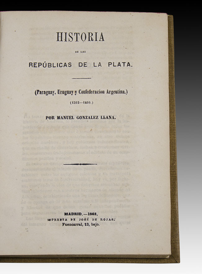 Asturiano, Manuel González Llana y Pruneda (1835 - 1911) fue un destacado periodista, docente y político. Publicó distintas obras; entre ellas “La Italia del Siglo XIX” (1861), “Méjico histórico y descriptivo” (1862), “La España del Siglo XIX” (1864), “Crónica de la Provincia de Salamanca” (1869) y “El imperio de Marruecos” (1879). En 1863 presentó “Historia de las repúblicas de la Plata (...), aquí en su edición príncipe.