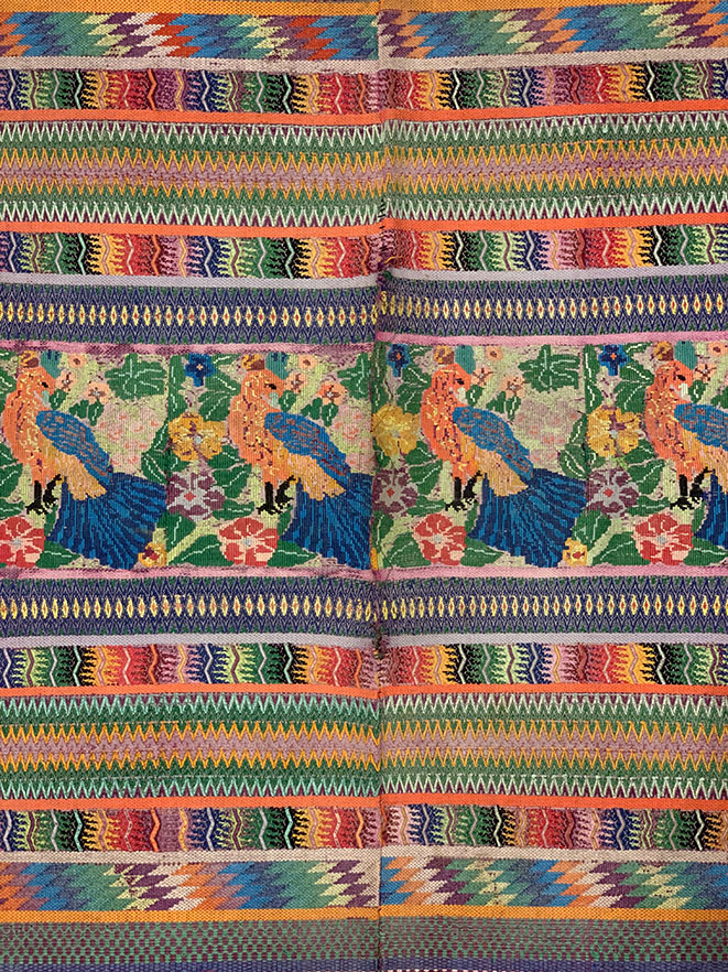 El pueblo de San Antonio Aguas Calientes se encuentra a diez km. de la ciudad de Antigua Guatemala y a cinco de la “Ciudad Vieja”, la primera capital del Reino de Guatemala, fundada en 1527 y bautizada como Ciudad de Santiago de los Caballeros. Cuando en 1541 ésta fue arrasada por un torrente de agua que descendió furiosa y sorpresivamente por la ladera del Volcán de Agua, sus habitantes se mudaron – y con ellos la capital- a la que hoy se conoce como Antigua Guatemala, la segunda capital, también abandonada cuando el terremoto de 1773 destruyó los magníficos templos religiosos –incluida la Catedral- cuyas ruinas puede hoy apreciar el viajero que la visite. También Aguas Calientes debió ser mudada pocos años después de su fundación, pero por el asedio repetido de plagas de langostas que hambreaban a sus pobladores. Decidieron entonces mudar el pueblo y cambiar su patrono; evidentemente San Bartolomé no resultaba eficaz contra la langosta y las autoridades de la Iglesia decidieron ponerlo bajo la advocación de San Antonio de Padua. (1) Curiosamente, no son sus aguas termales las que le han dado prestigio, sino sus tejidos, los más finamente elaborados de toda Centroamérica. A la técnica clásica del brocado de trama visible en una sola faz de la tela, incorporaron otra, que reproduce en ambas caras de la tela la misma figura, una doble faz perfecta.