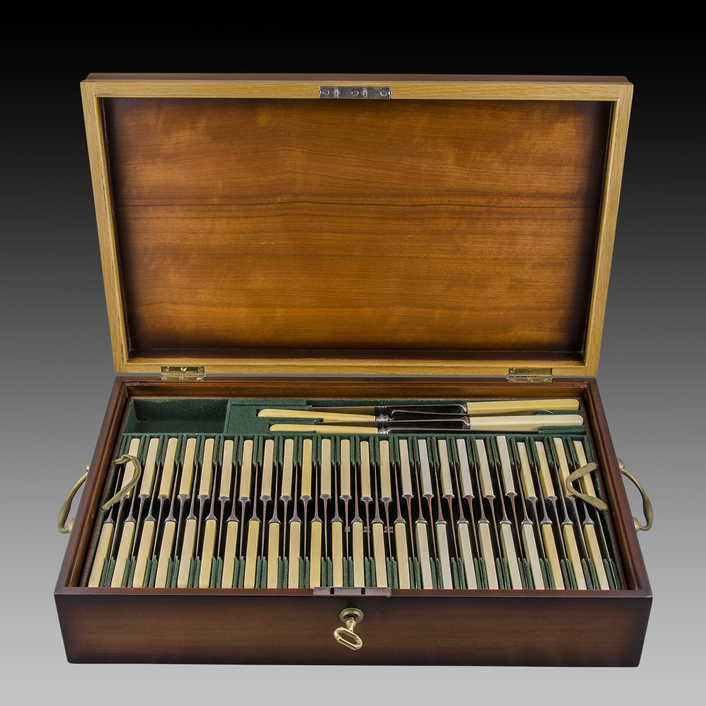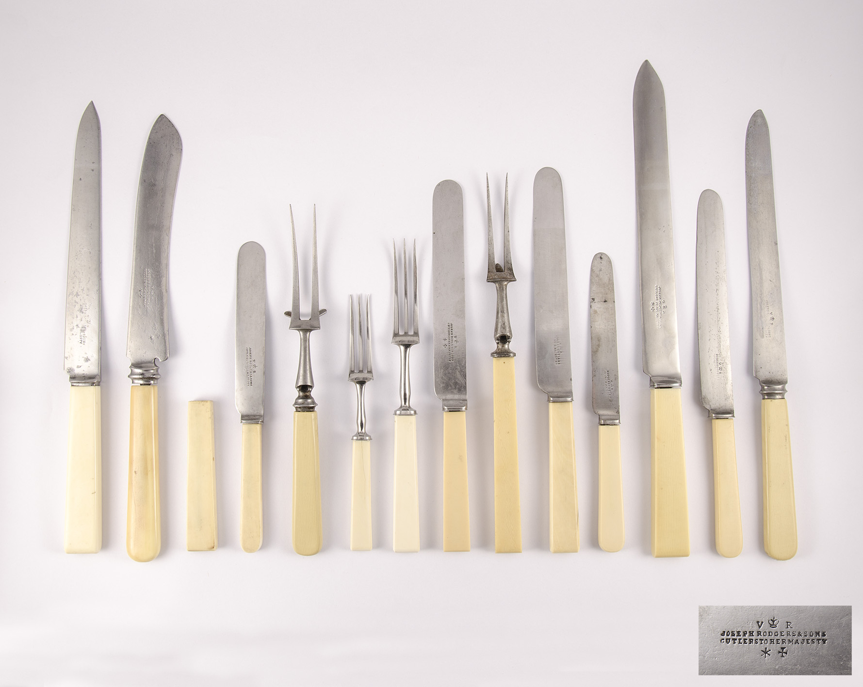 A modo de síntesis, identificamos dos juegos de trinchar, otros cubiertos de servir y un abundante conjunto de cubiertos de plato principal y de postre; cuchillos y tenedores, estos últimos sin marca de fabricante, mientras que los cuchillos llevan el cuño de J. Rodgers & Son. E incluso cuatro cabos (empuñaduras de cuchillos) sueltos, sin duda, fruto de la continua búsqueda del coleccionista.