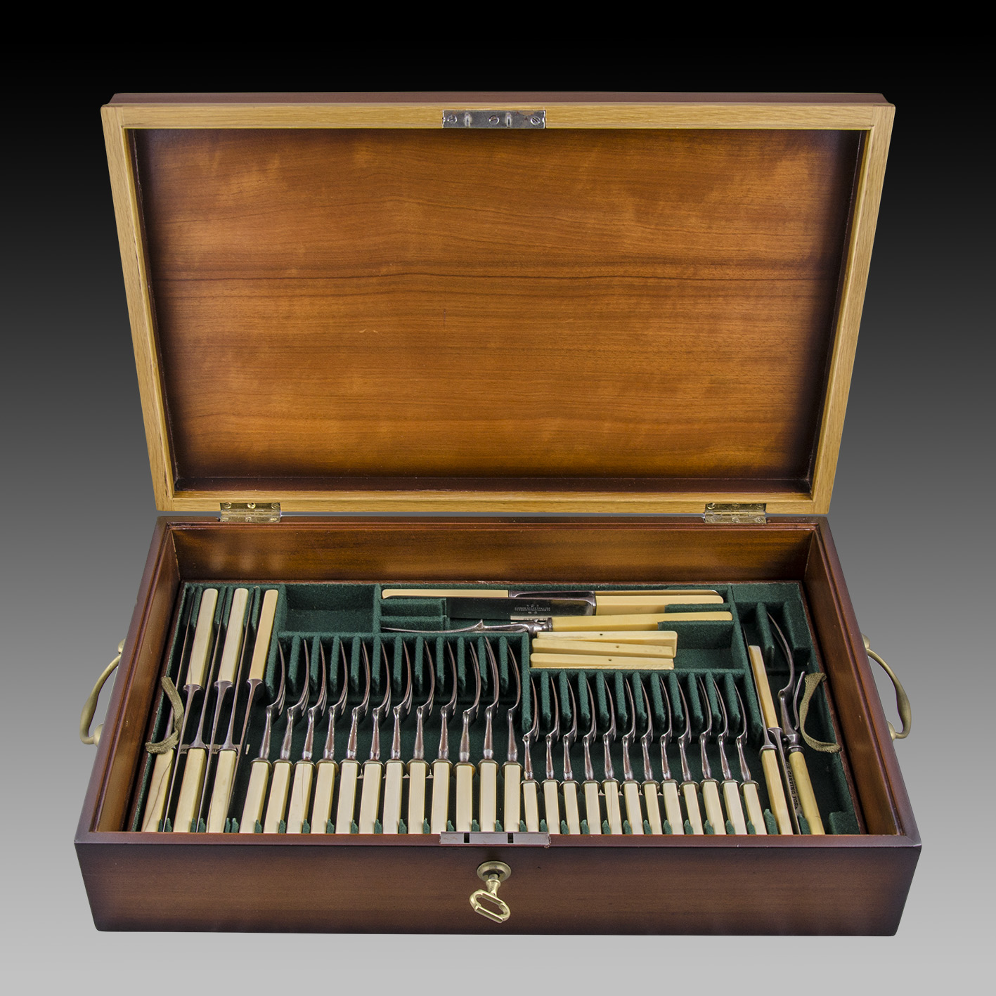 Sorprendente e importante conjunto de cubertería de mesa formado por un perseverante coleccionista quien reunió 126 piezas; ciento una de ellas identificadas con una de las marcas más prestigiosas de la cuchillería mundial: Joseph Rodgers & Son. La colección se presenta en una caja sin identidad de marca, la que contiene tres pisos con los distintos elementos e indicando con etiquetas impresas qué tipo de utensilios se alojan.