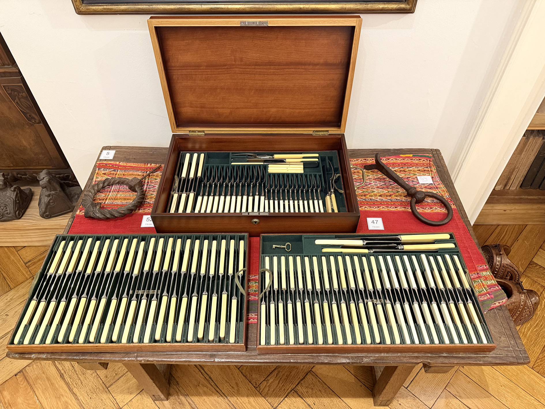 Entre tantas piezas observamos que se reunieron cabos de marfil y de galatita -algunos con las clásicas rasgaduras-, un material sintético conocido como marfil artificial.